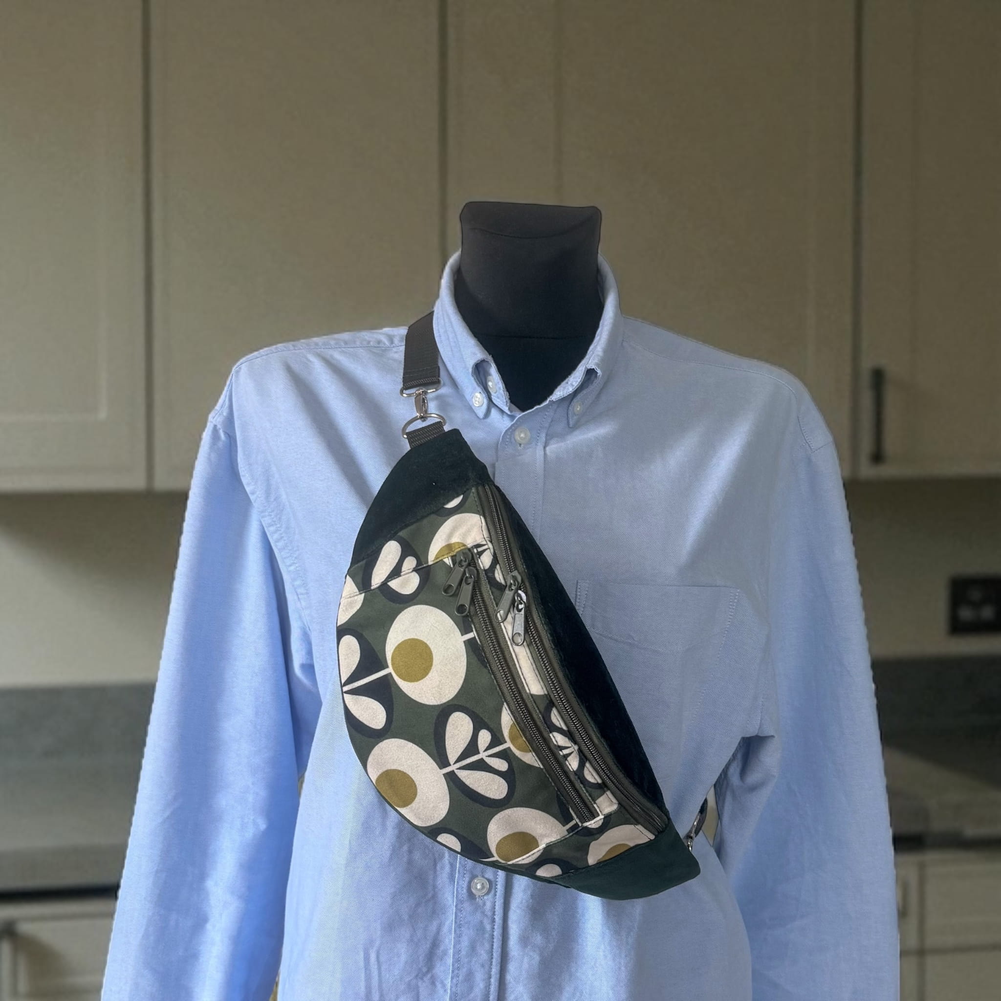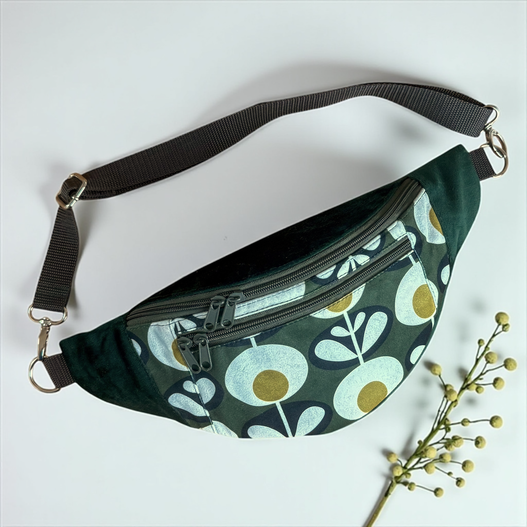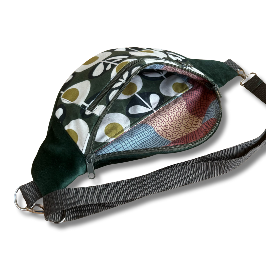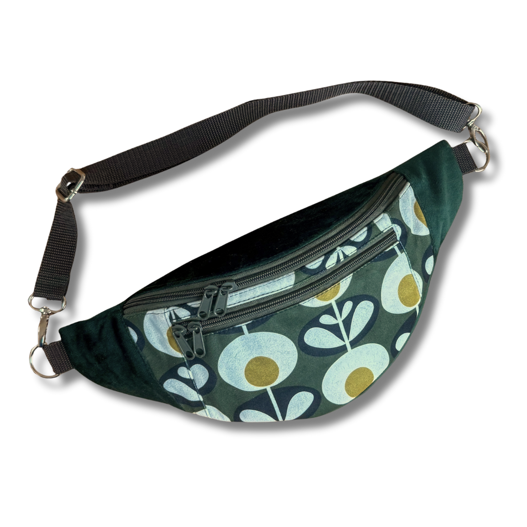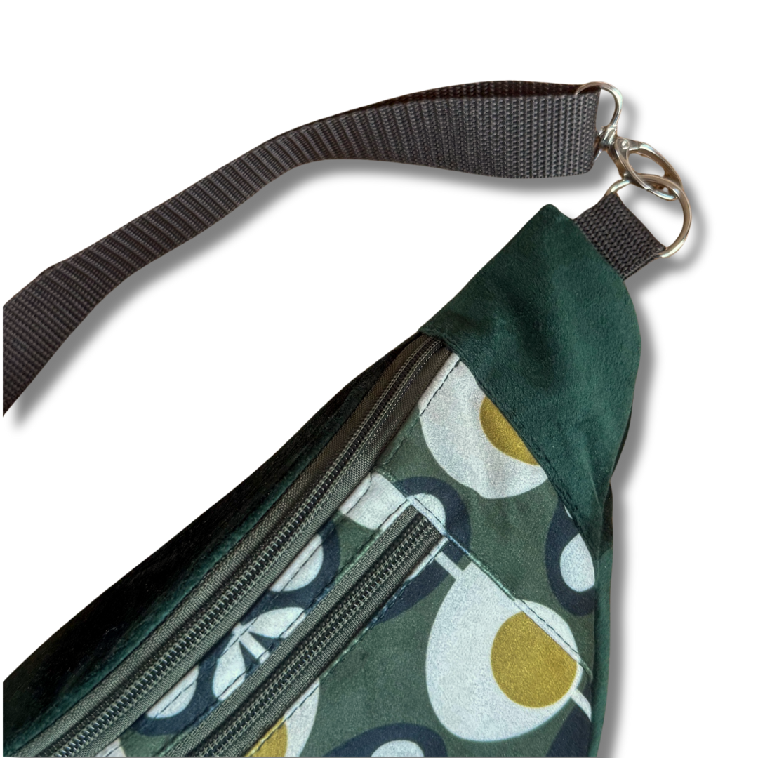 Pojemna nerka uszyta ręcznie w Polsce z końcówek dwóch tkanin tapicerskich: gładkiego weluru w kolorze butelkowej zieleni i welury w oryginalny wzór dmuchawców. Ta nerka jest unikatem - powstała tylko jedna sztuka i nie będzie więcej. nie spotkasz na ulicy nikogo z taką samą.