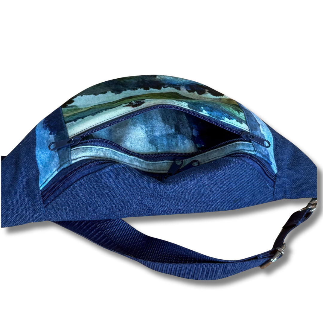 Pojemna nerka uszyta ręcznie w Polsce z końcówek dwóch tkanin tapicerskich: jedna to welur, fragment panelu na poduszki - aksamitny w dotyku a druga to granatowa, pleciona tkanina obibciowa. Obie mocne i wytrzymałe. Ta nerka jest unikatem - powstała tylko jedna sztuka i nie będzie więcej. nie spotkasz na ulicy nikogo z taką samą.