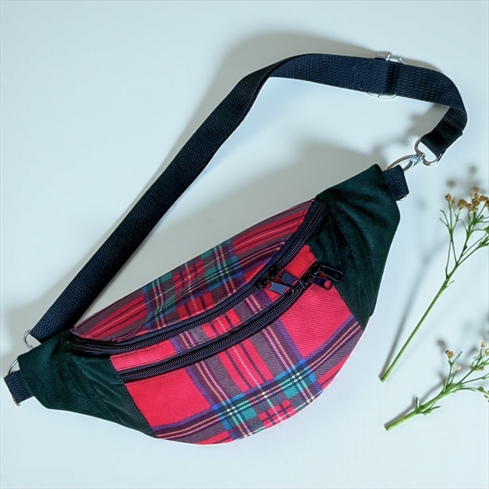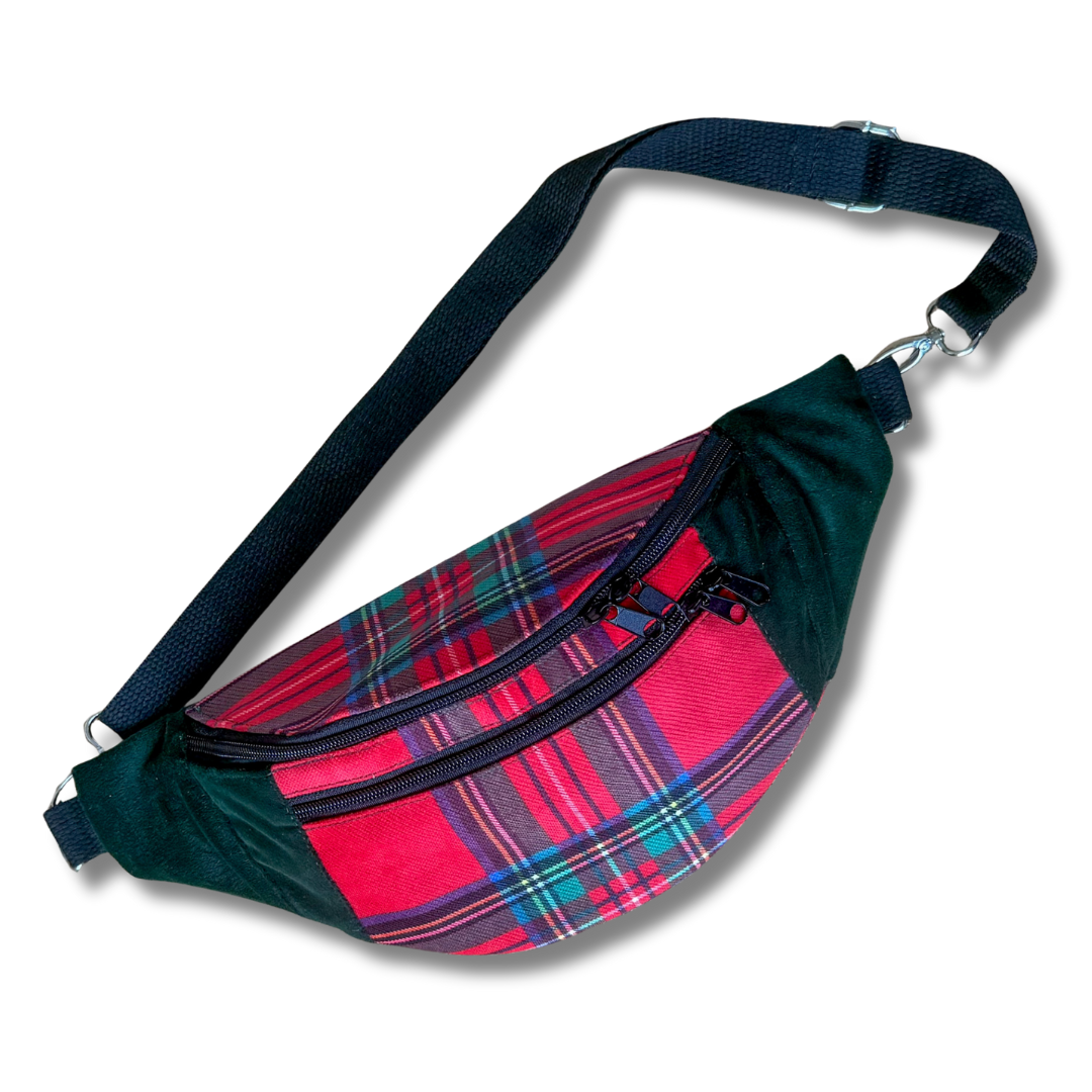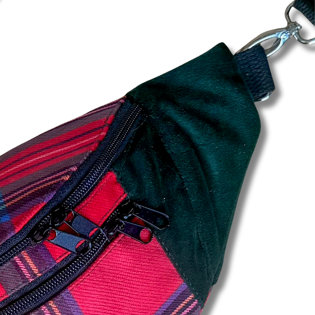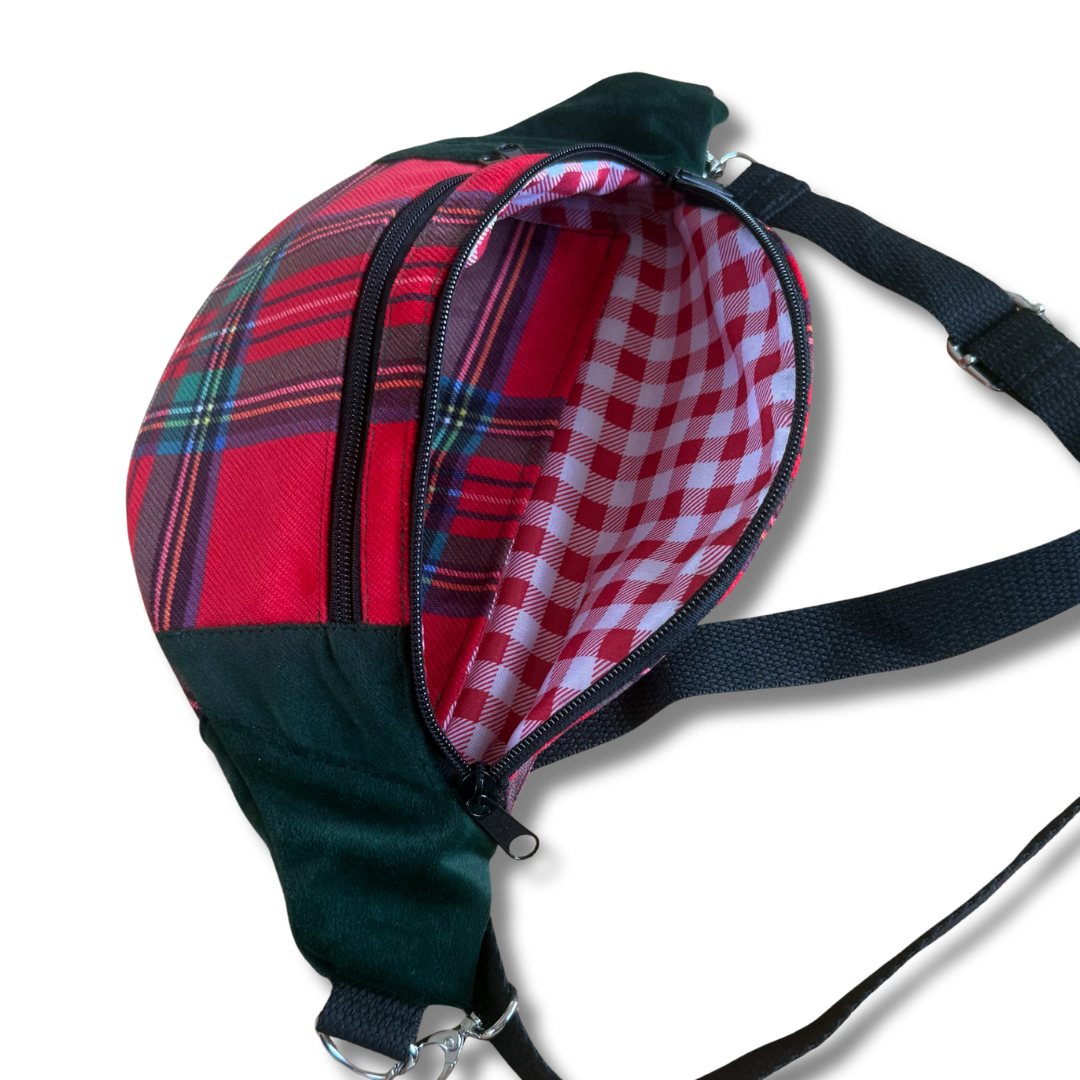 Pojemna nerka uszyta ręcznie w Polsce z końcówek dwóch tkanin tapicerskich: połączenia weluru w kolorze butelkowej zieleni z welurem w czerwoną, szkocką kratkę. Ta nerka jest unikatem - powstała tylko jedna sztuka i nie będzie więcej. nie spotkasz na ulicy nikogo z taką samą.