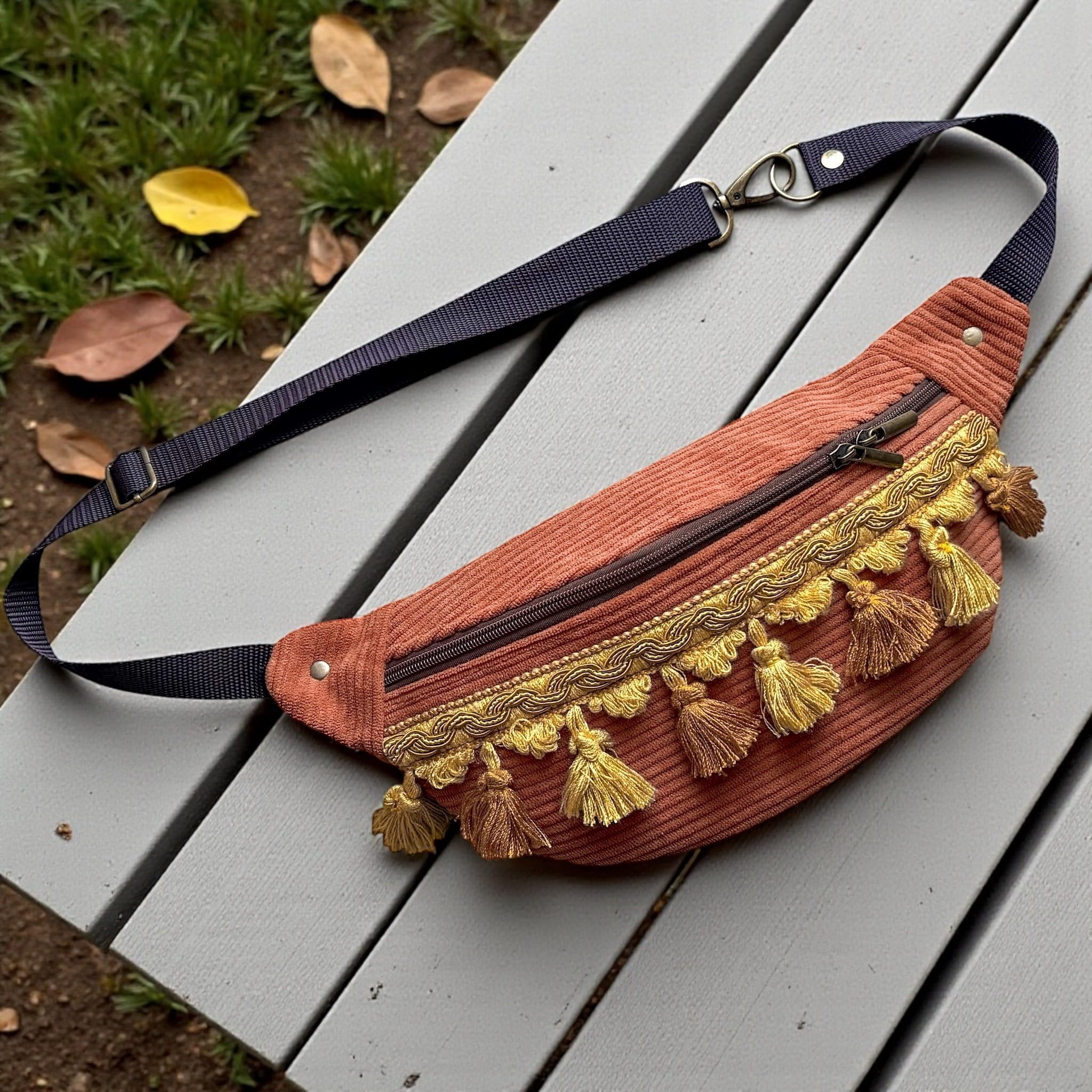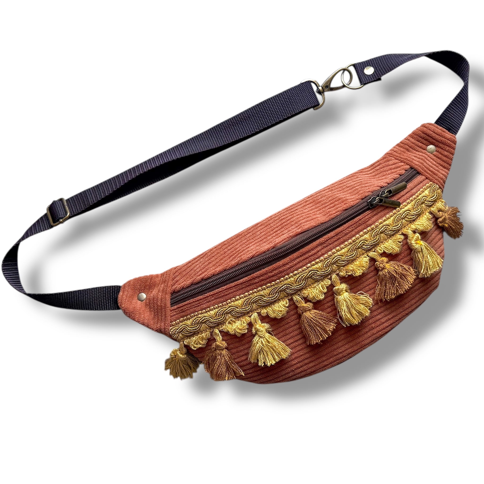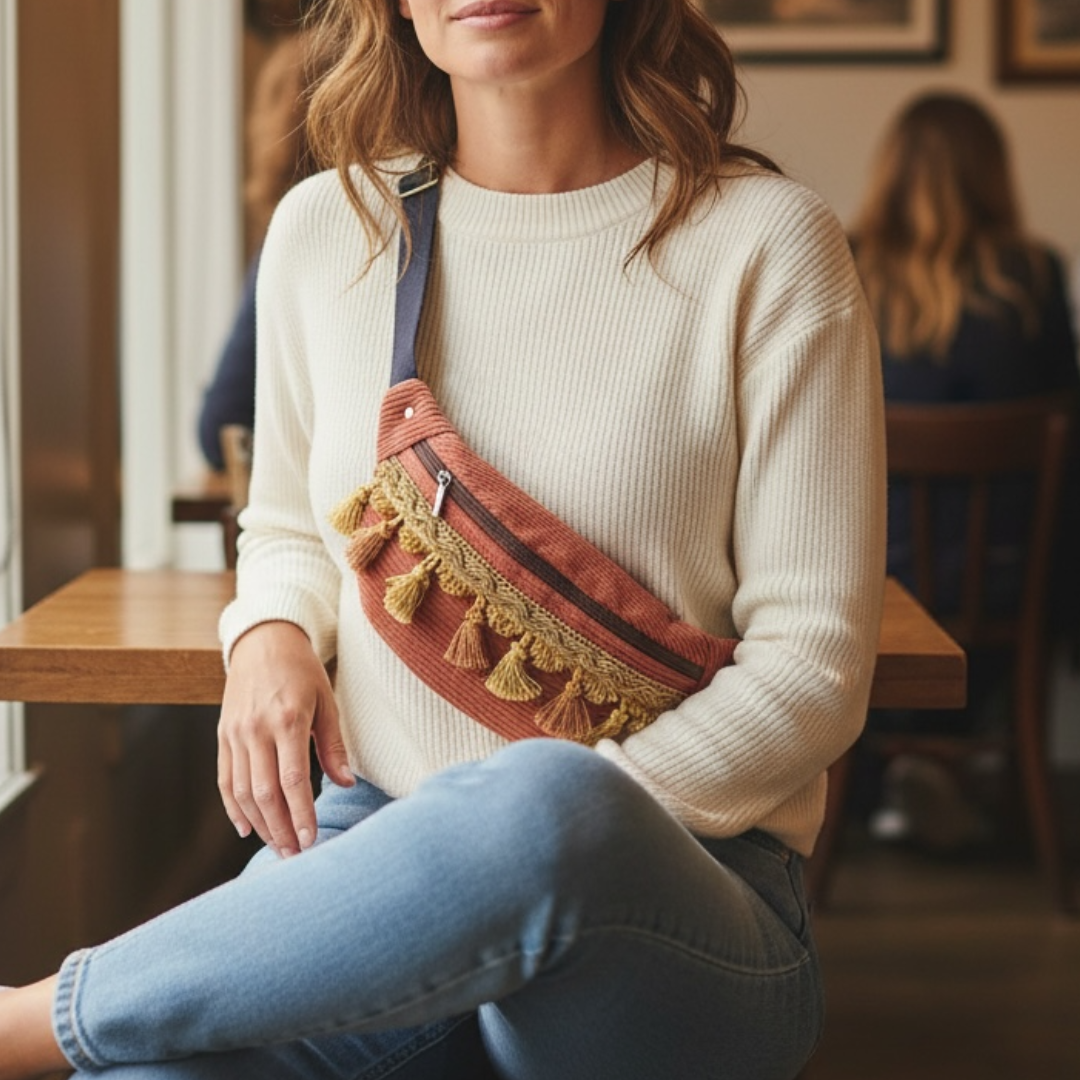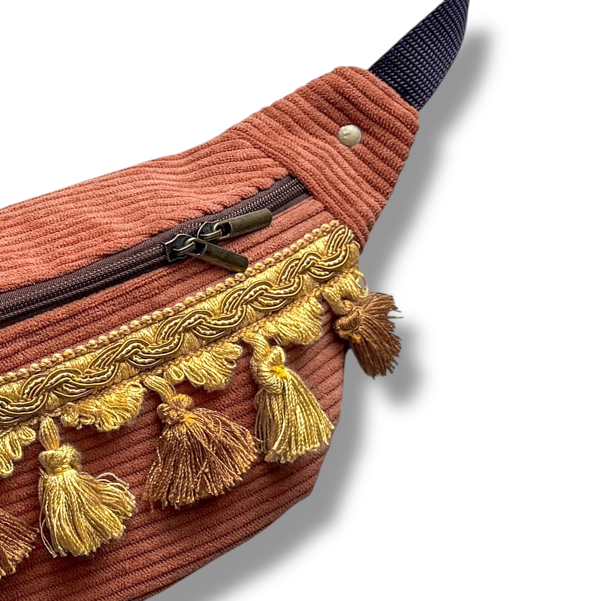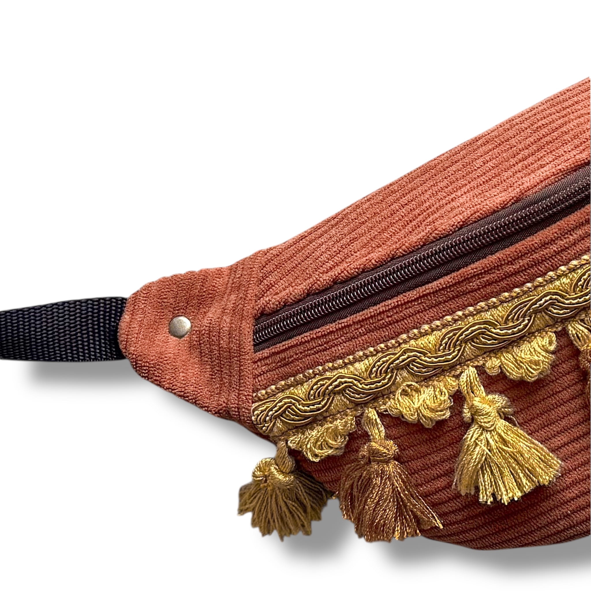 Lubisz dodatki, które są praktyczne, a jednocześnie mają charakter? Ta nerka została uszyta z miękkiego sztruksu w w rdzawym kolorze. Efektu dodają doszyte frędzle w kolorze starego złota. Dzięki prążkowanej fakturze i ciekawemu zestawieniu barw świetnie urozmaici codzienne stylizacje, a modne odcienie dodają jej świeżości i sprawiają, że łatwo dopasujesz ją do trendów.