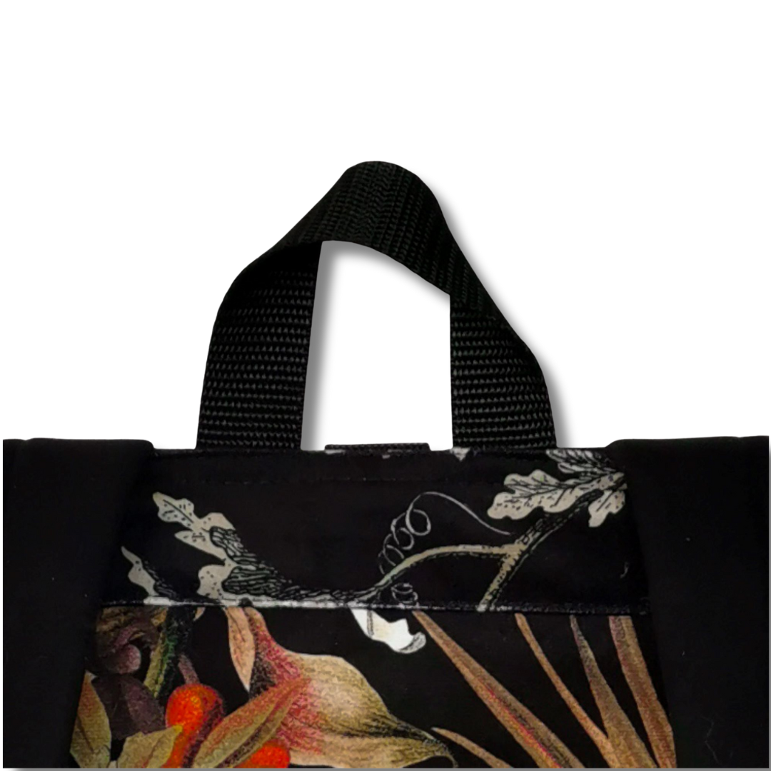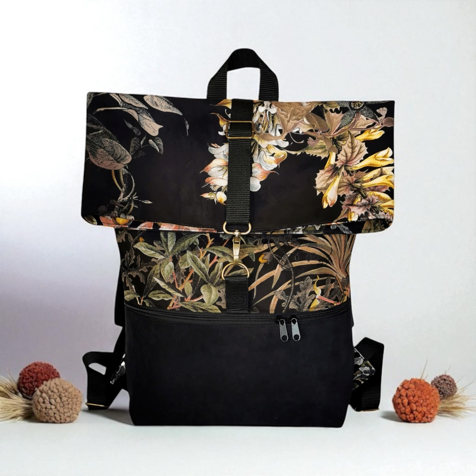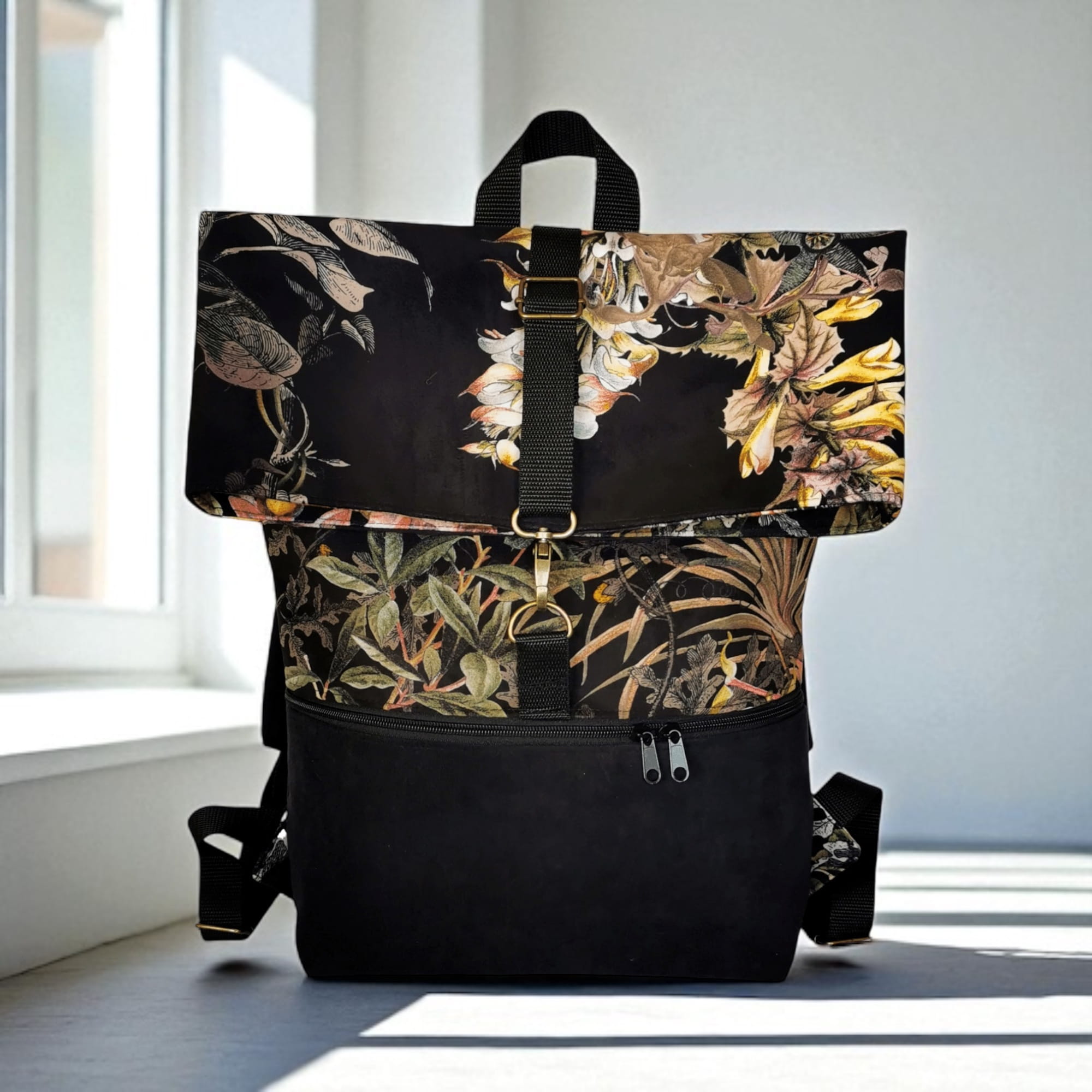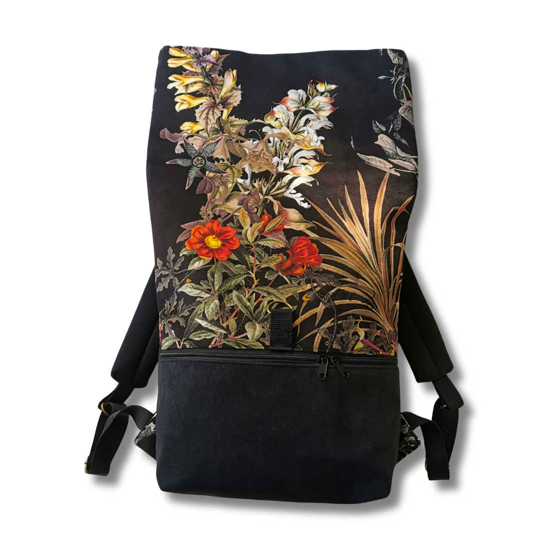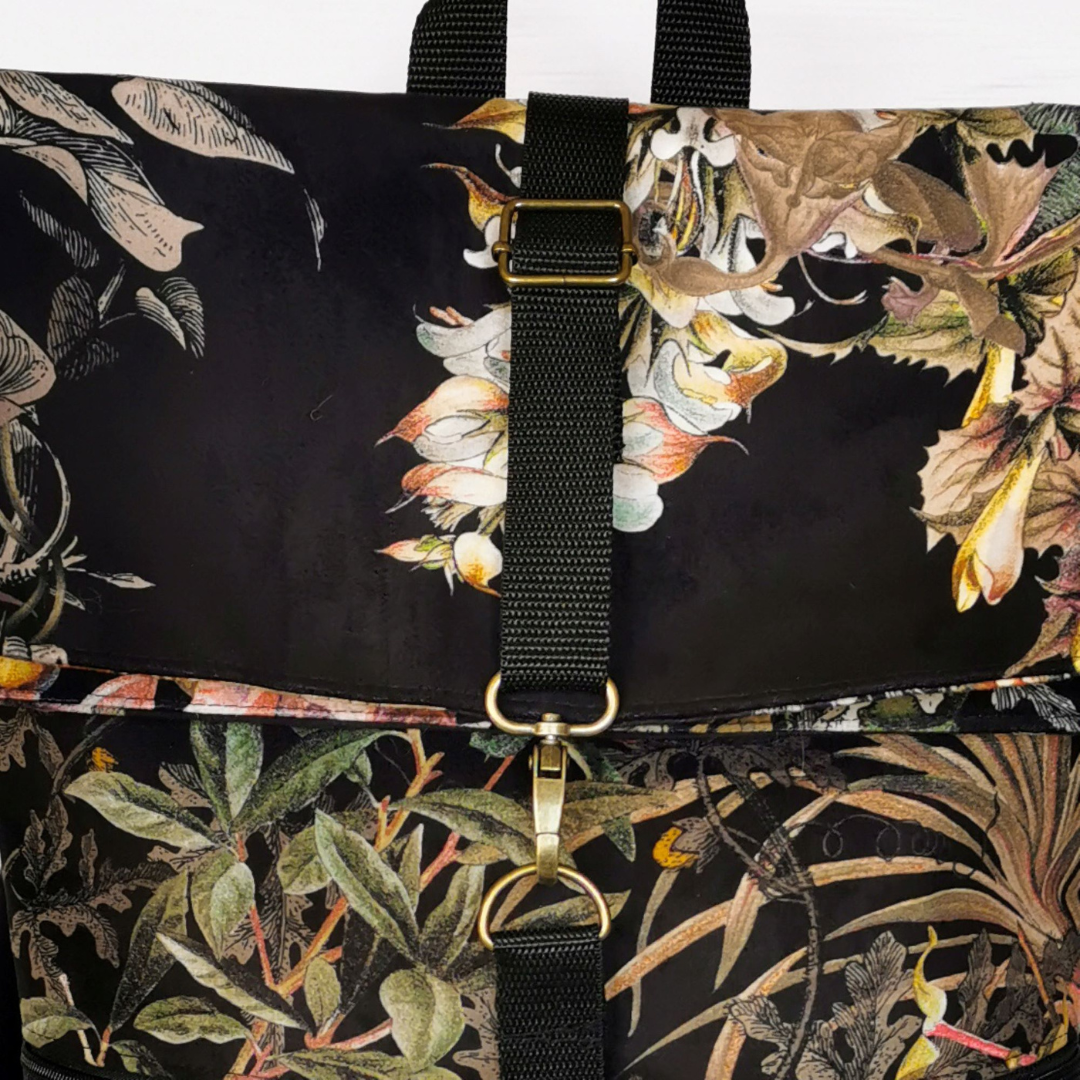 Uszyty z wysokogatunkowego weluru tapicerskiego z motywem kwiatów i traw – materiału przyjemnego w dotyku, a jednocześnie wytrzymałego i odpornego na przetarcia. Idealny na co dzień – do miasta, na spacer, do pracy czy na uczelnię.