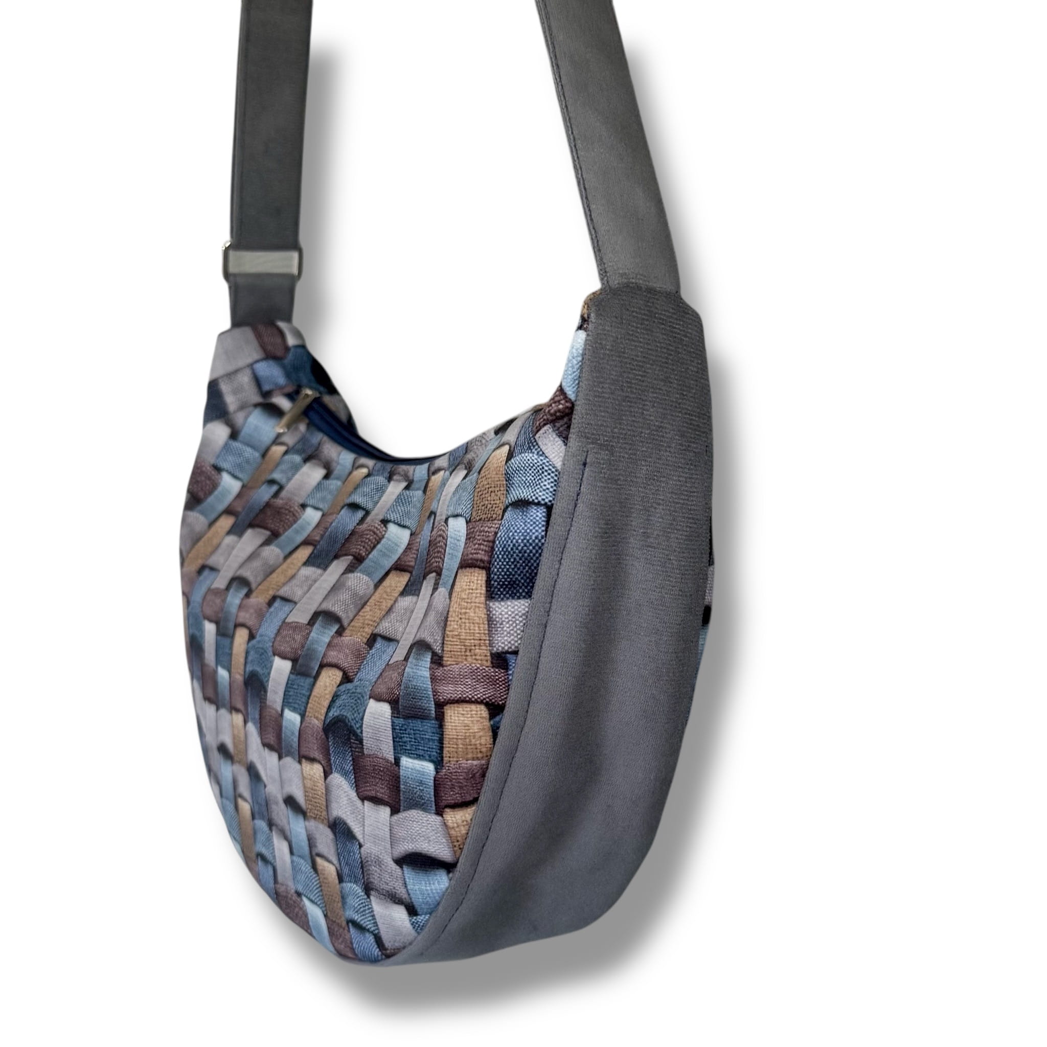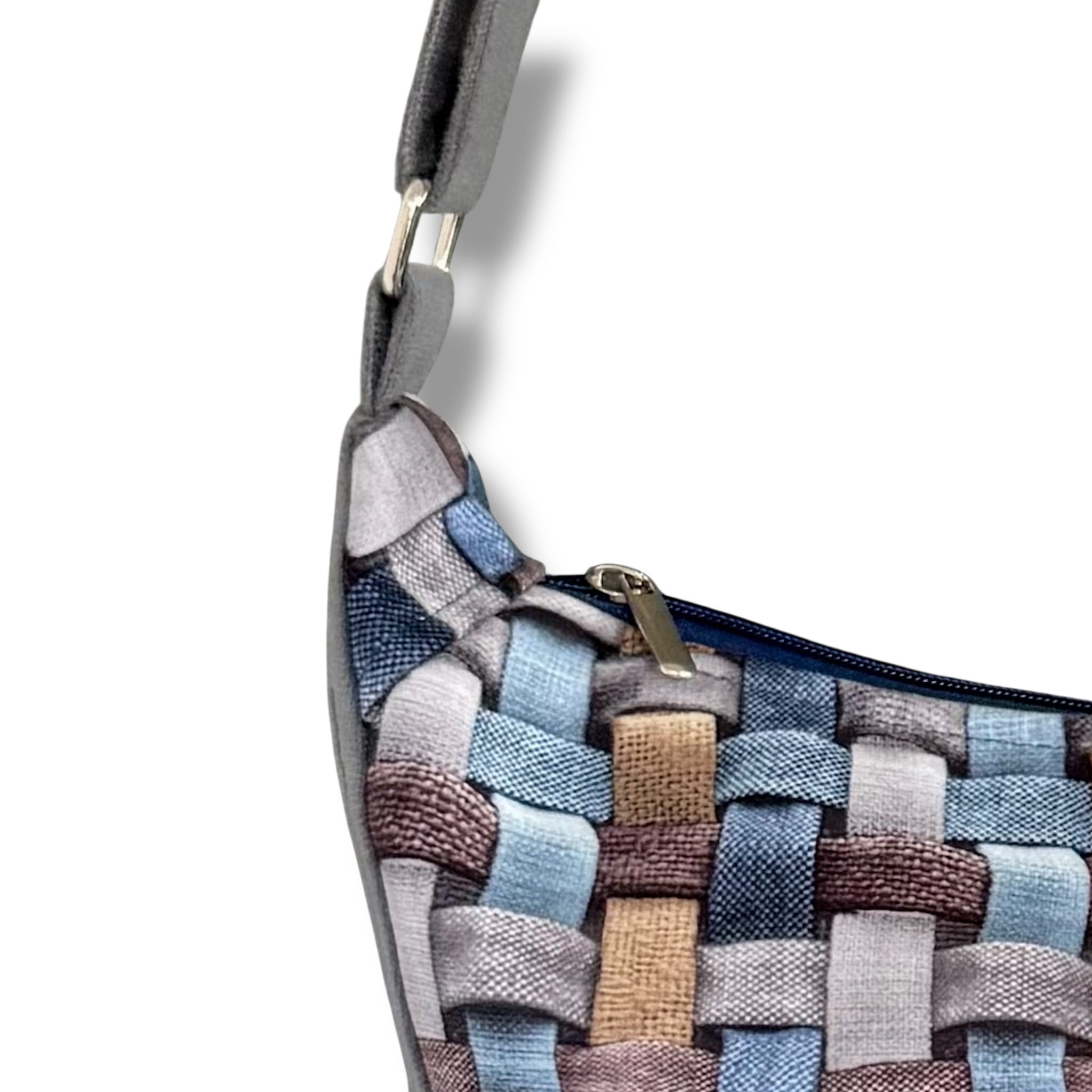 Delikatny welur w imitujący plecione paski w rożnych odcieniach szarości. Klasyczny fason półksiężyca łączy wygodę z codzienną elegancją.