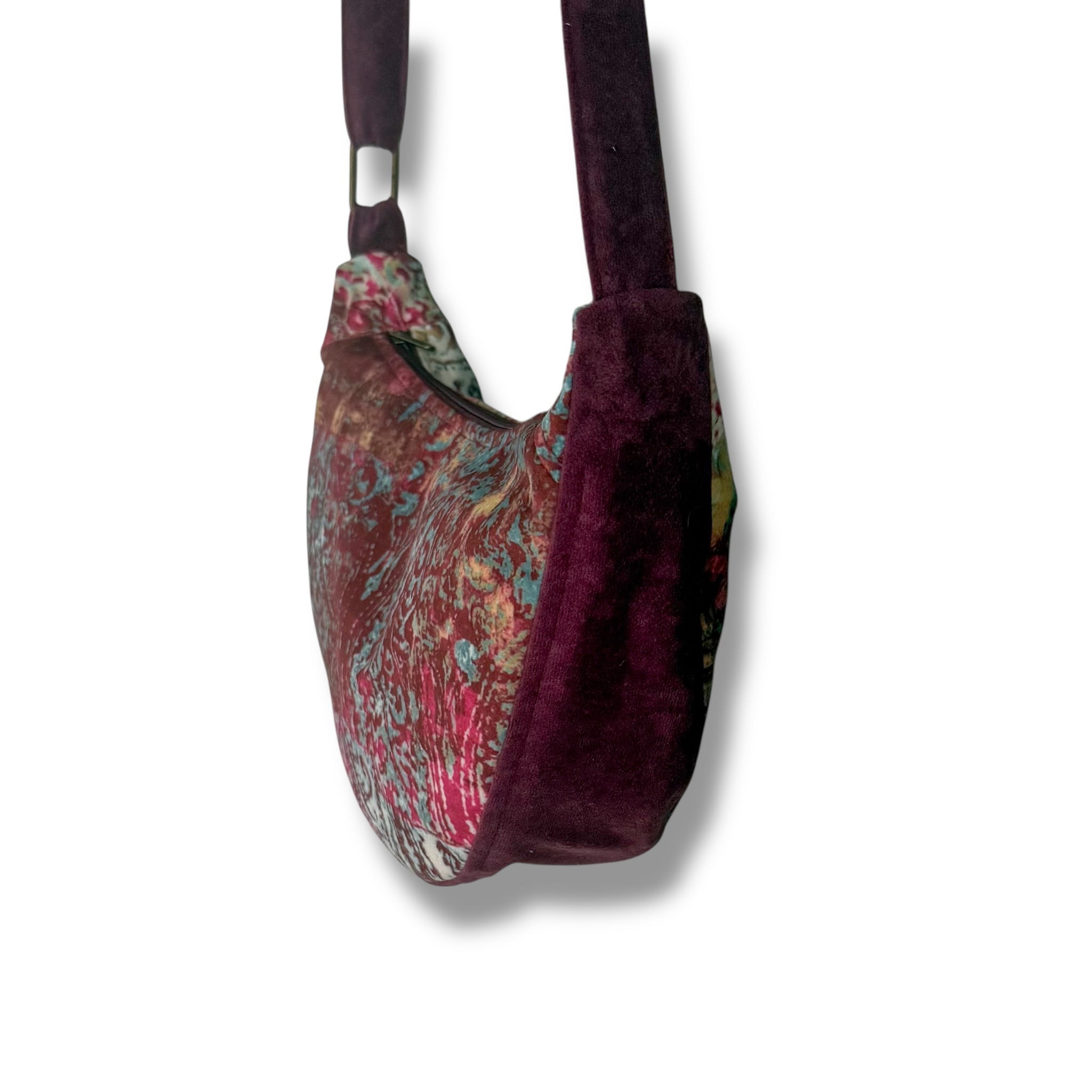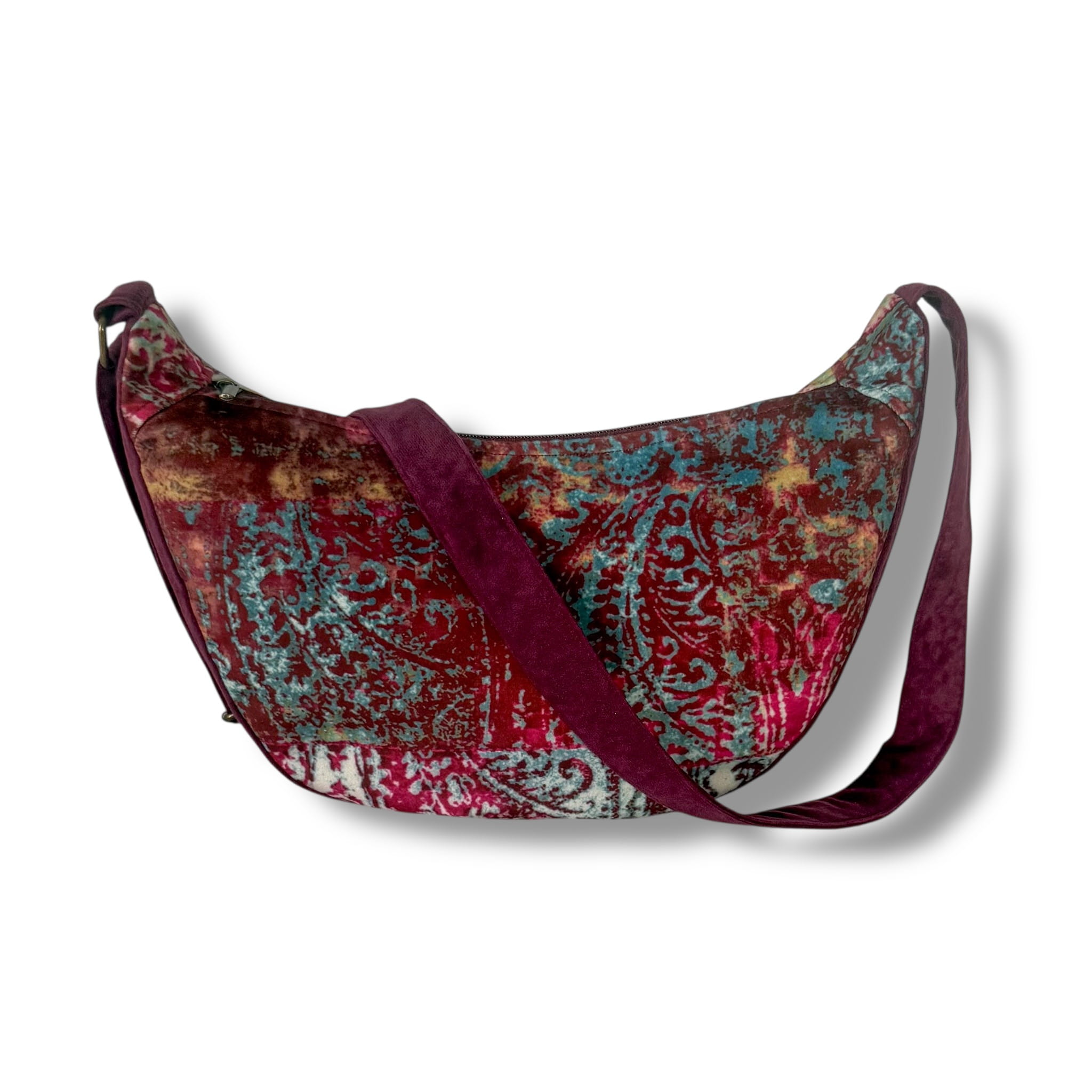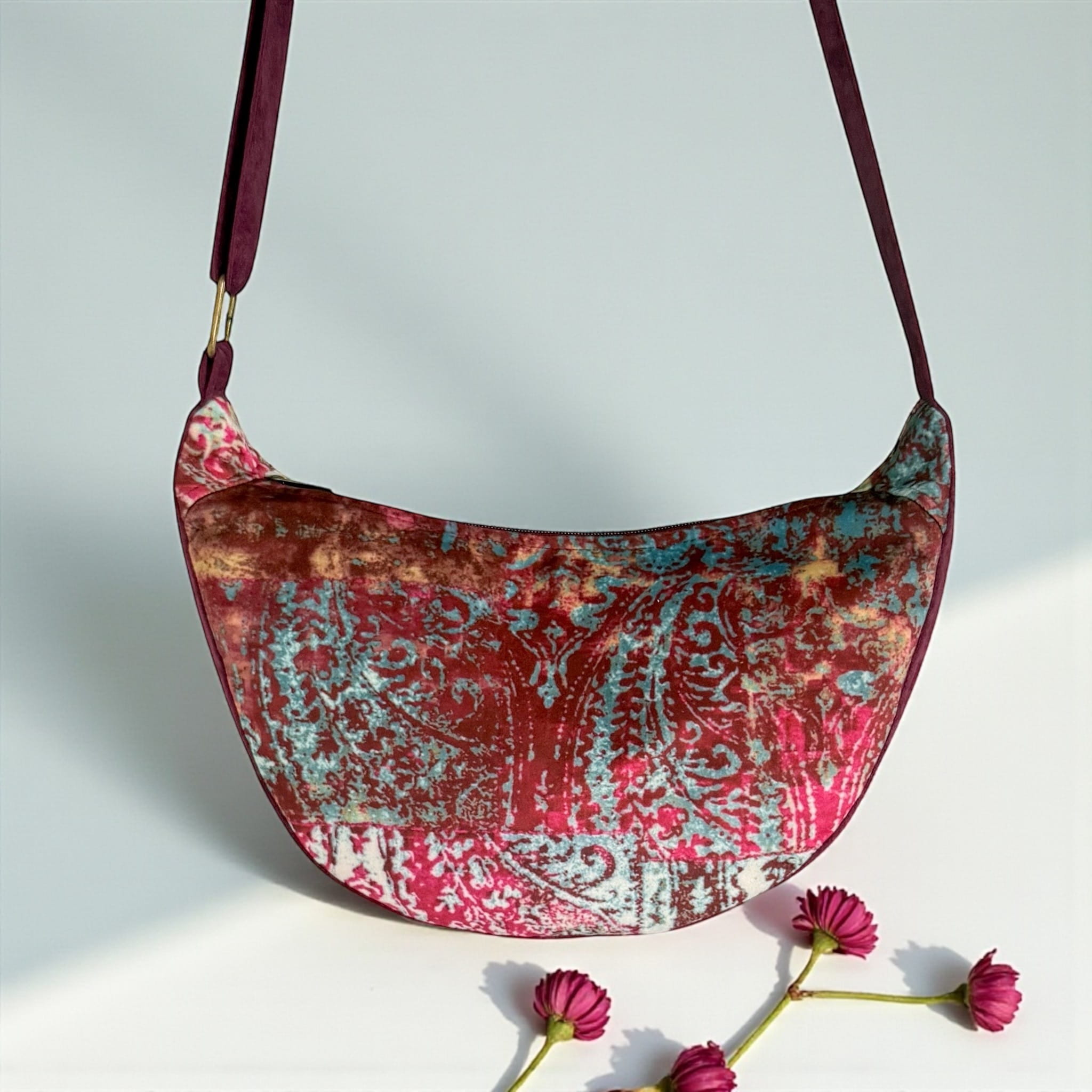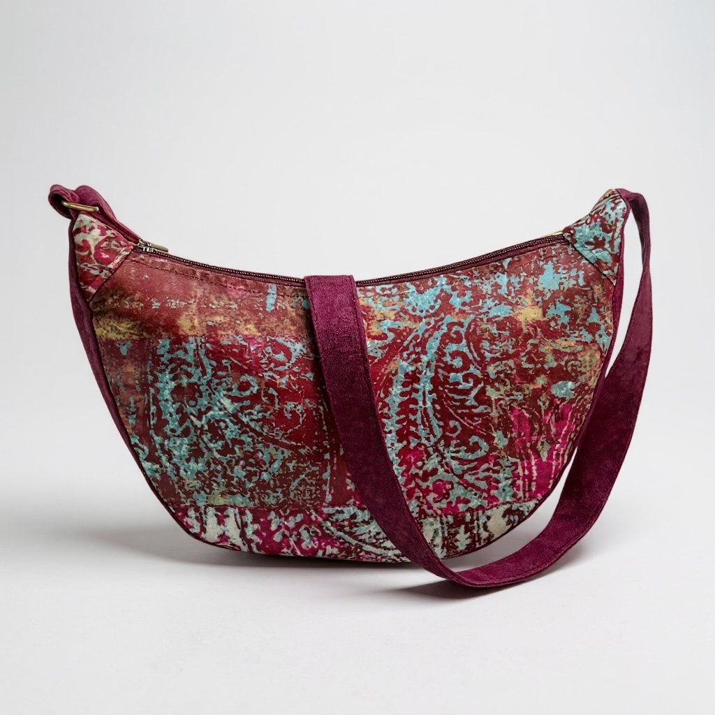 Delikatny welur w różnych odcieniach purpury i fioletu nadaje torebce unikalny wygląd. Wzór to lekko postarzone arabskie arabeski. Klasyczny fason półksiężyca łączy wygodę z codzienną elegancją.