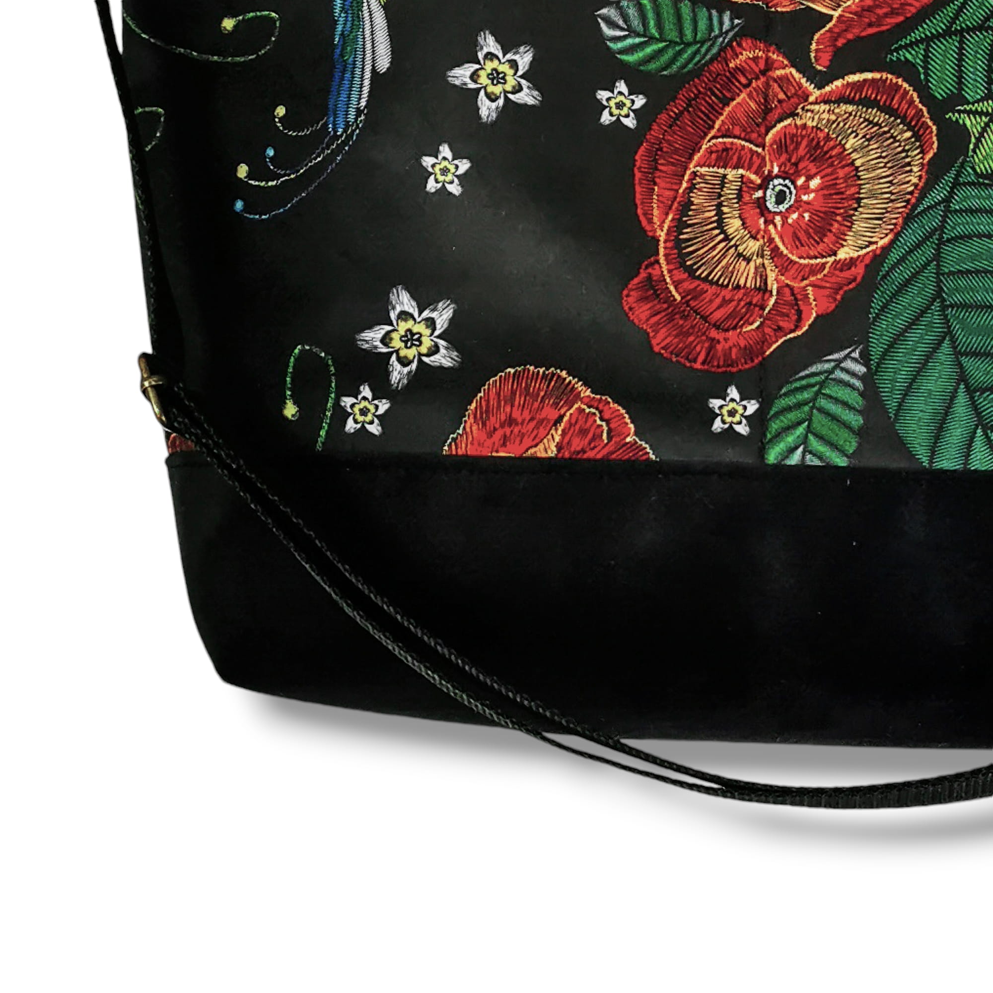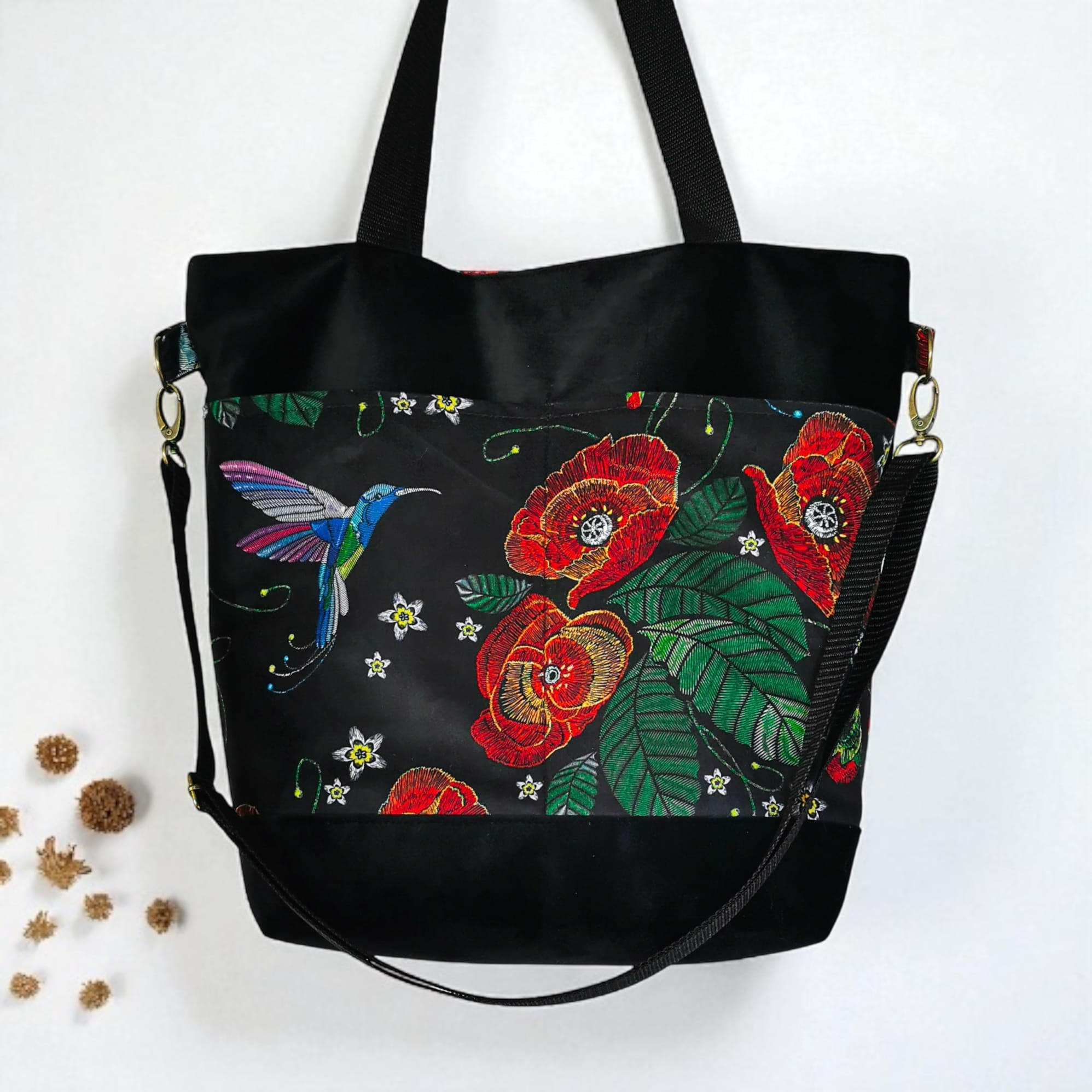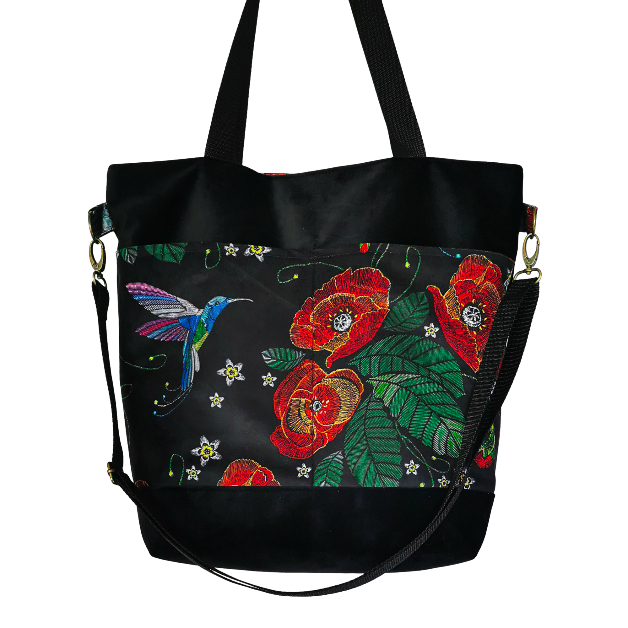 Ta torebka powstała z końcówki materiału (welur tapicerski czarny i drukowany w maki i kolibry) jaki został po uszyciu innej torebki :).