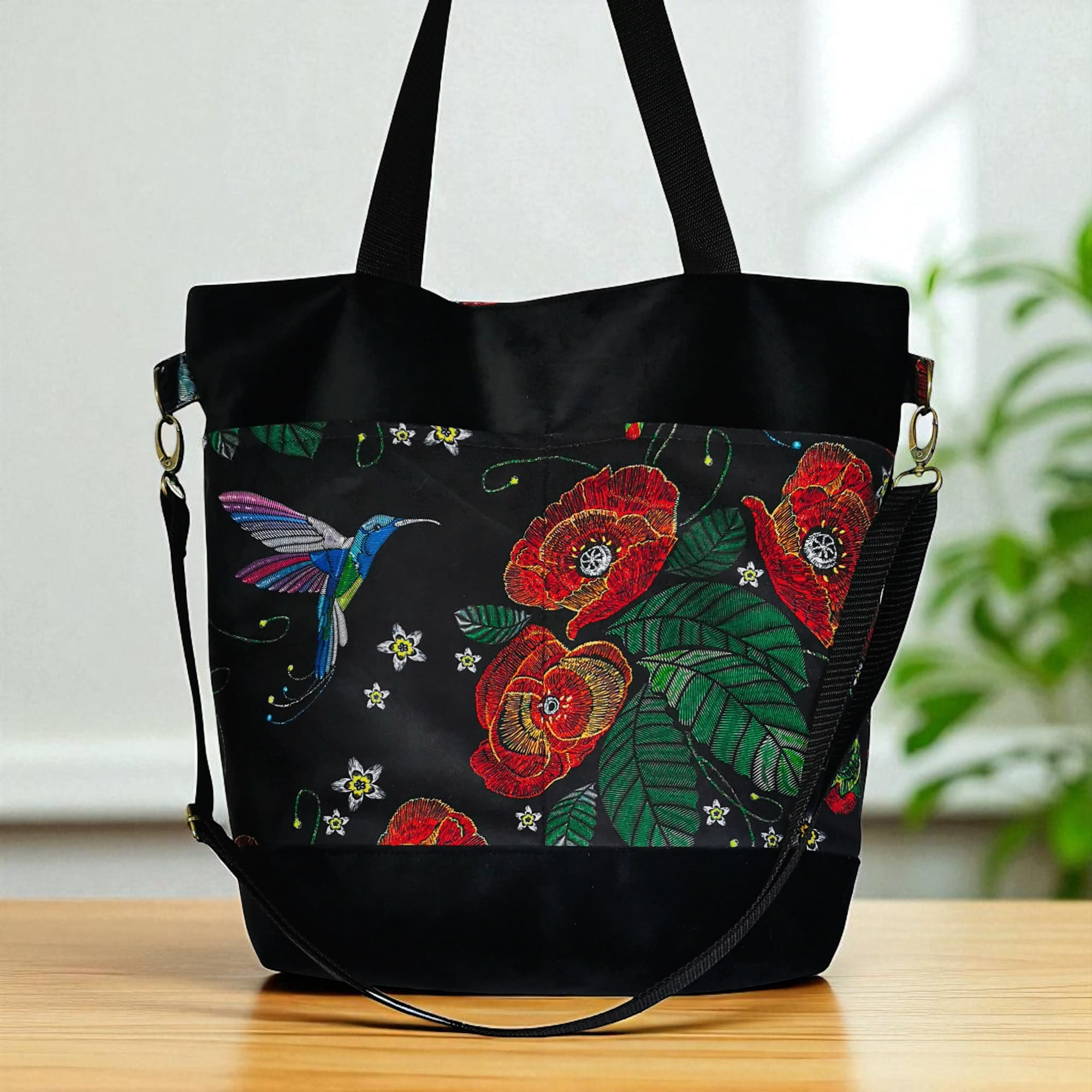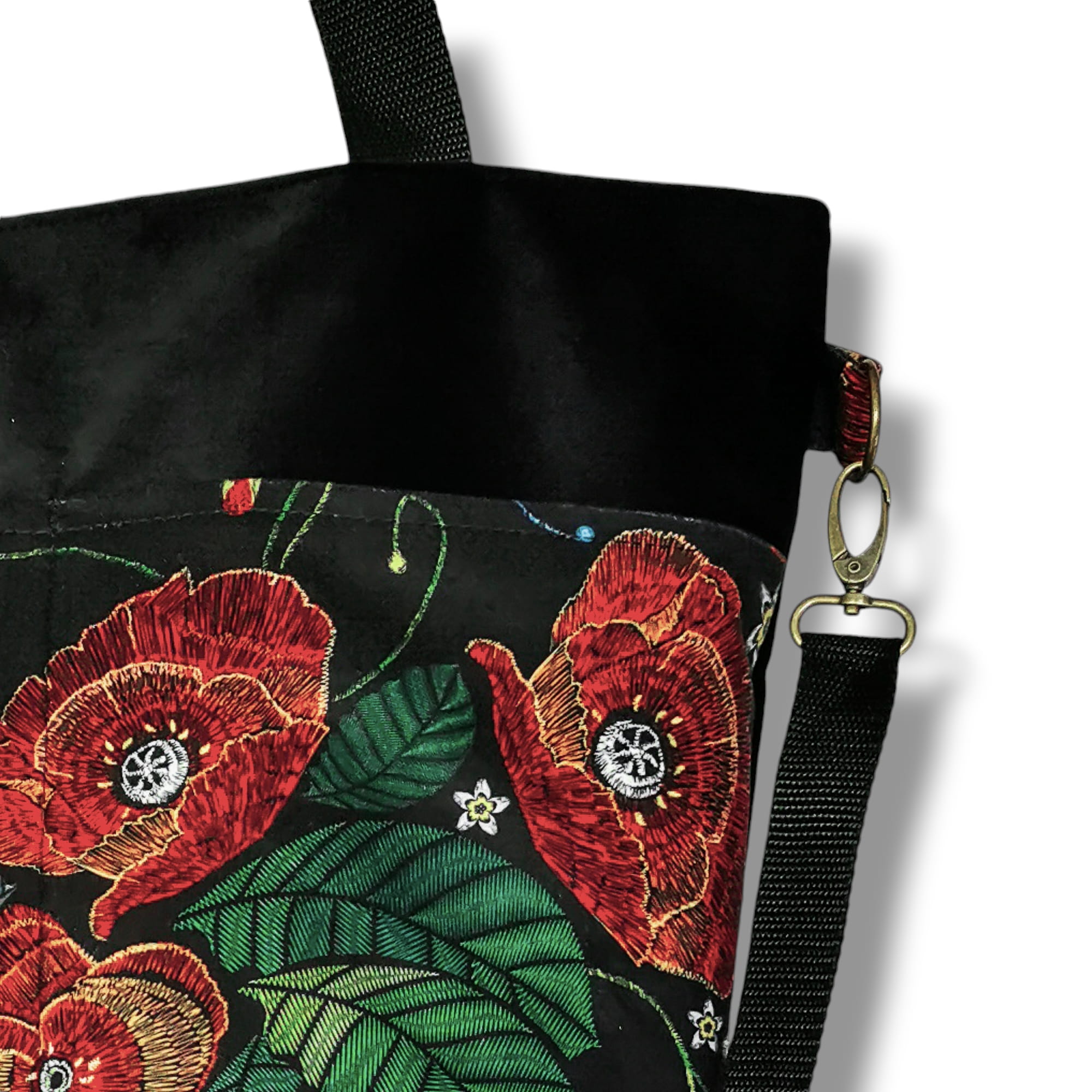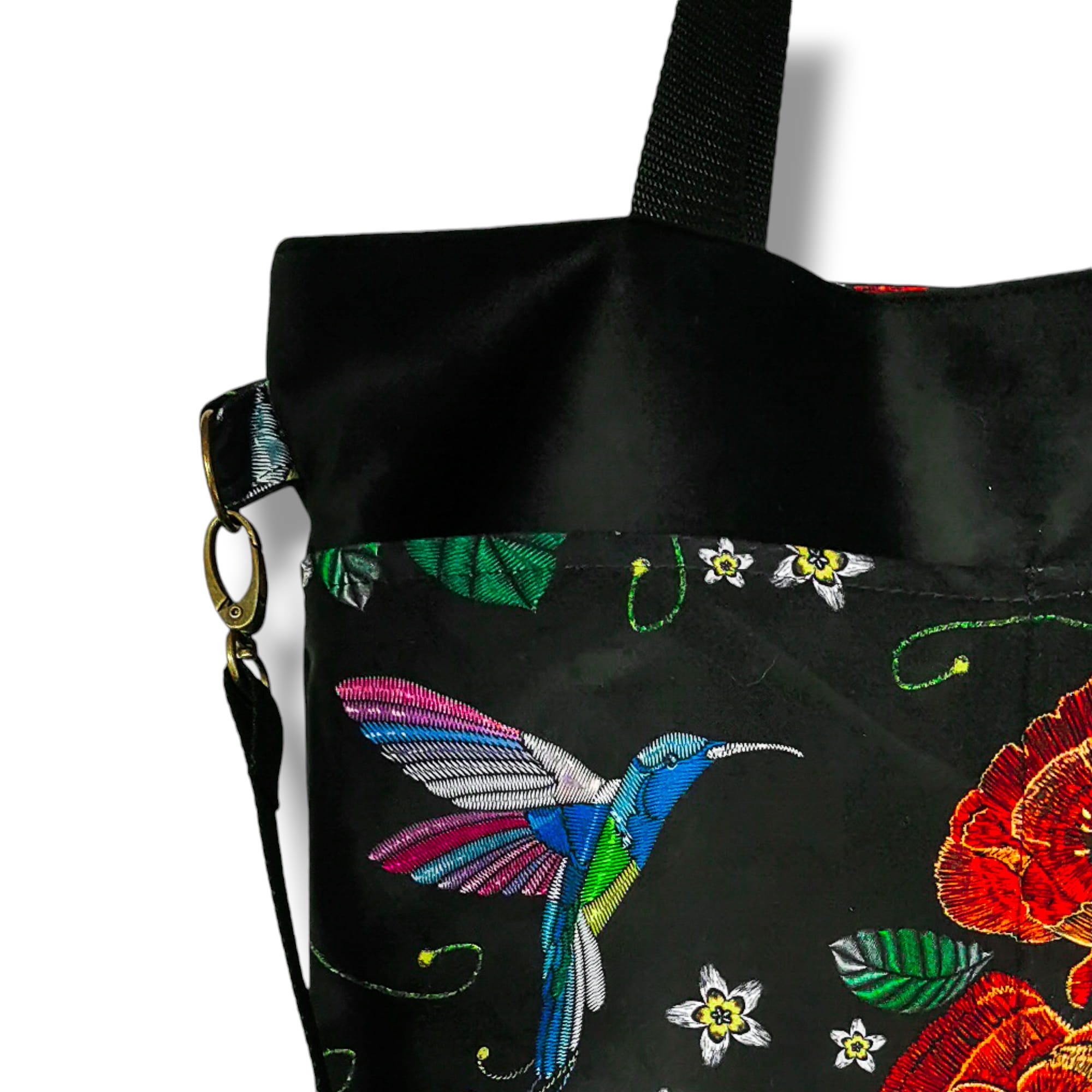 Ta torebka powstała z końcówki materiału (welur tapicerski czarny i drukowany w maki i kolibry) jaki został po uszyciu innej torebki :).
