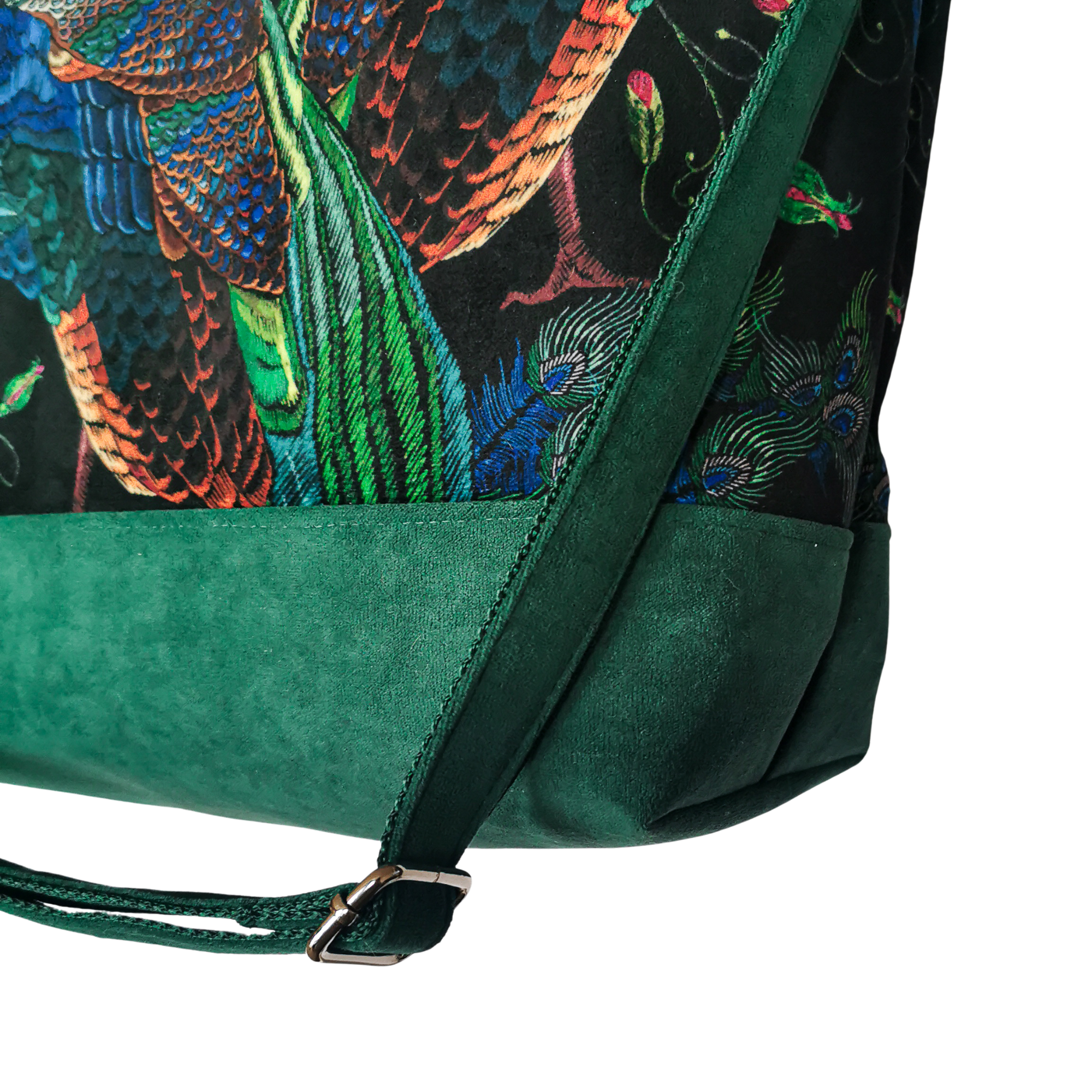 Wykonana z miękkiego, szlachetnego weluru tapicerskiego – w zachwycający wzór pawich piór i głęboki odcień zieleni – łączy luksus z trwałością. Ten materiał nie traci kolorów, nie mechaci się i nie farbuje. To torebka, która przez lata wygląda tak doskonale, jak w dniu zakupu.