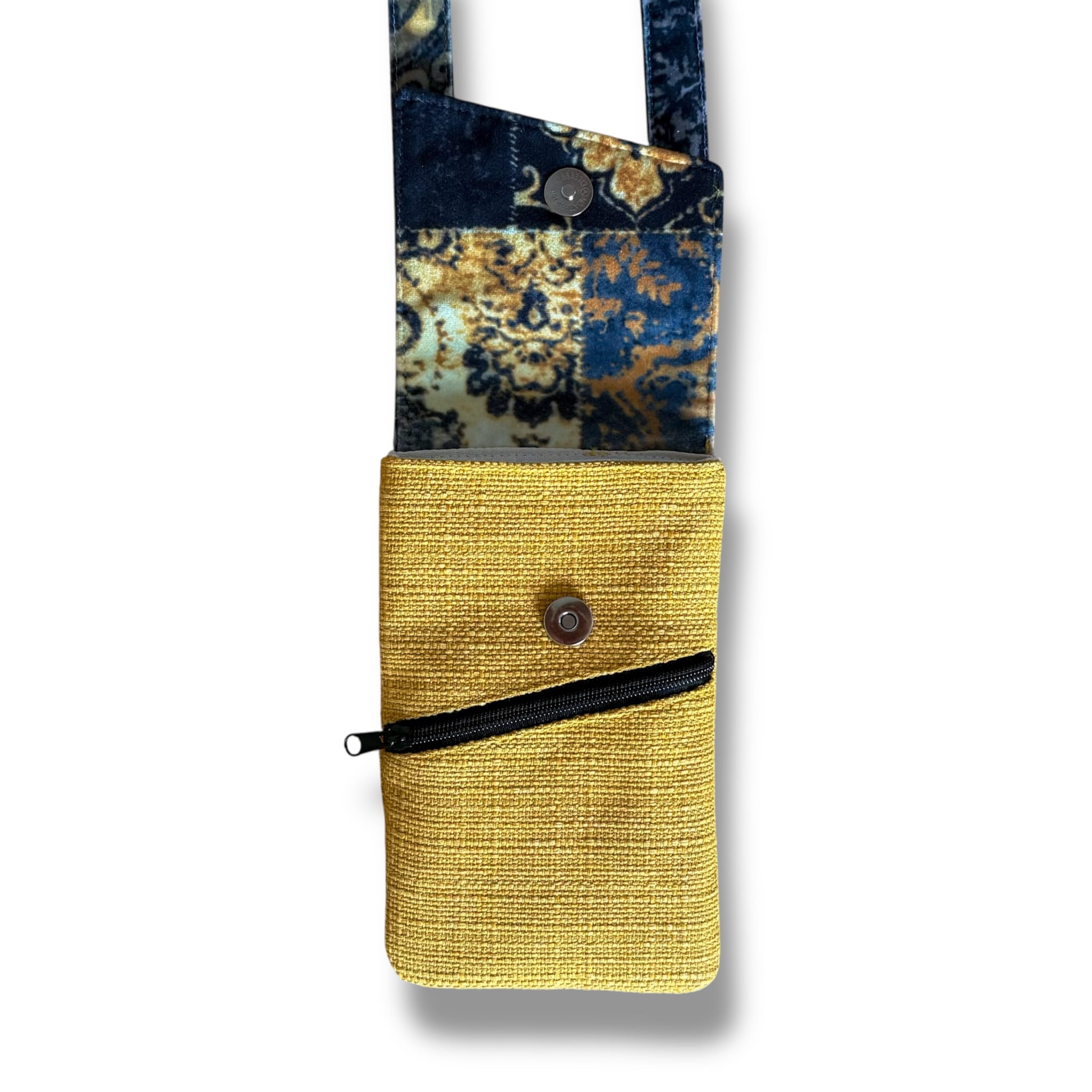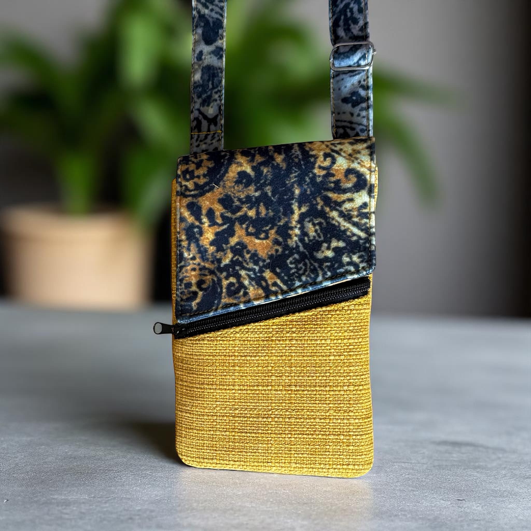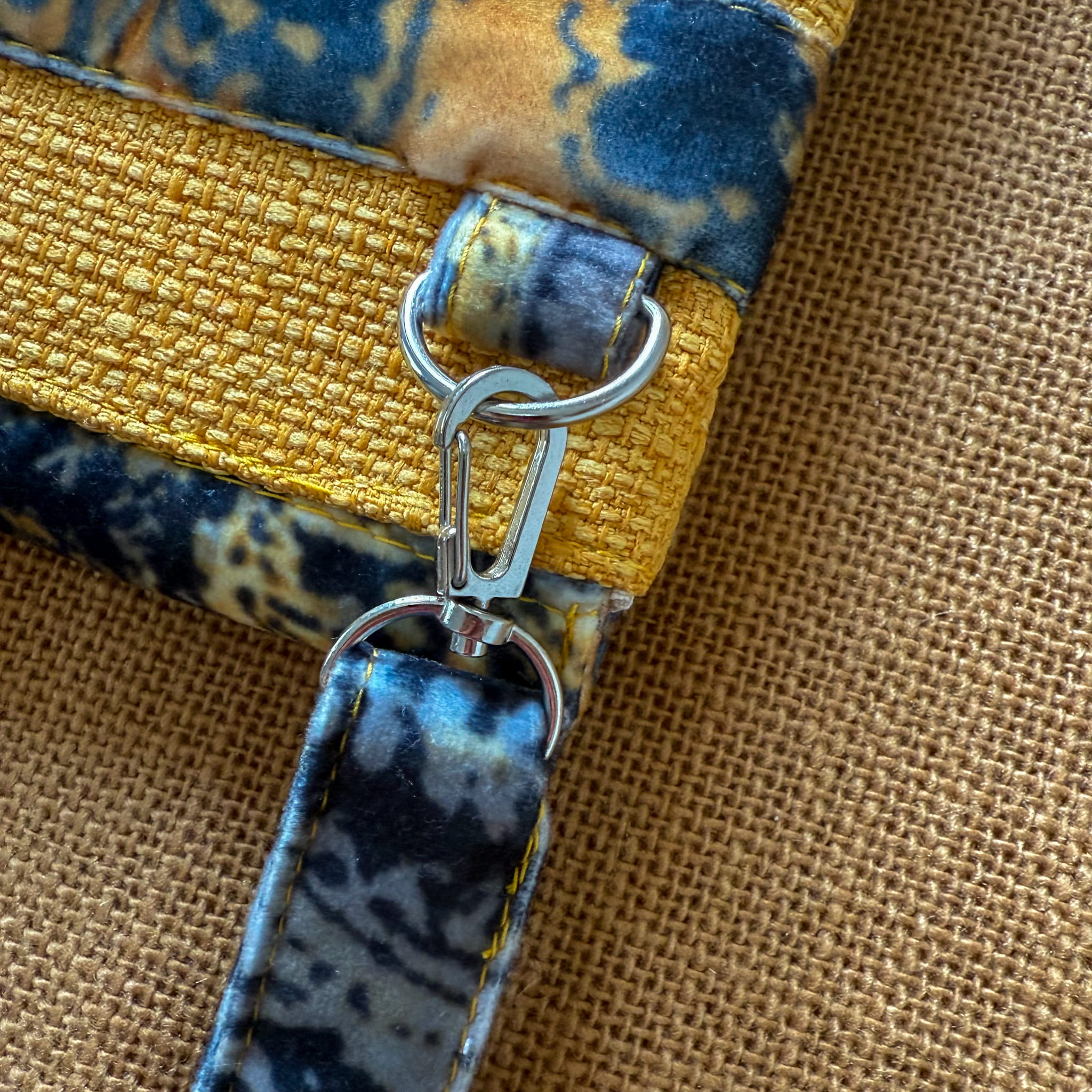 Powstała tylko jedna taka sztuka. Uszyta z końcówek tkanin tapicerskich: czarno żółtego weluru i żółtej tkaniny obiciowej o grubym splocie – to upcykling w praktyce. Dzięki temu masz pewność, że nikt inny nie będzie miał identycznej.