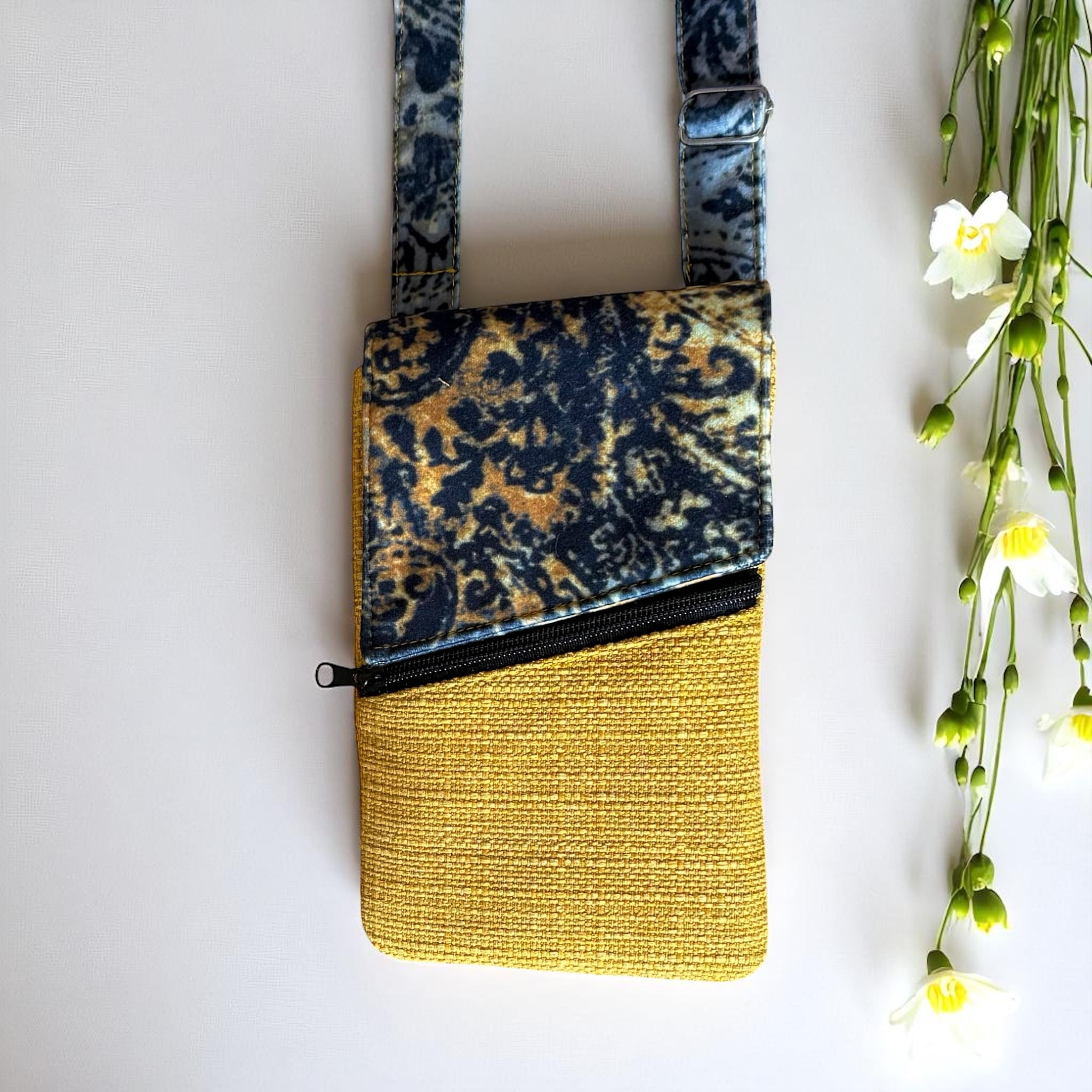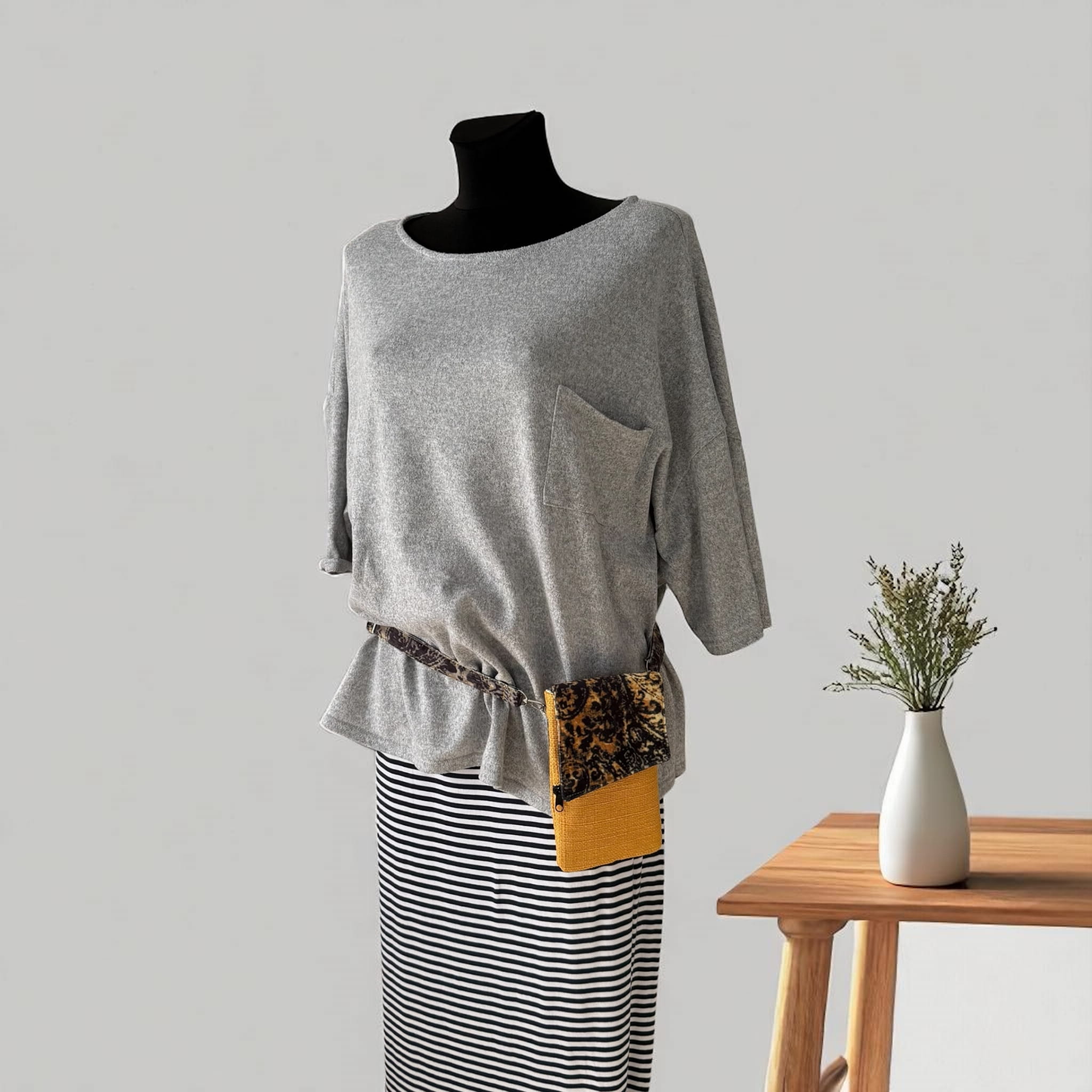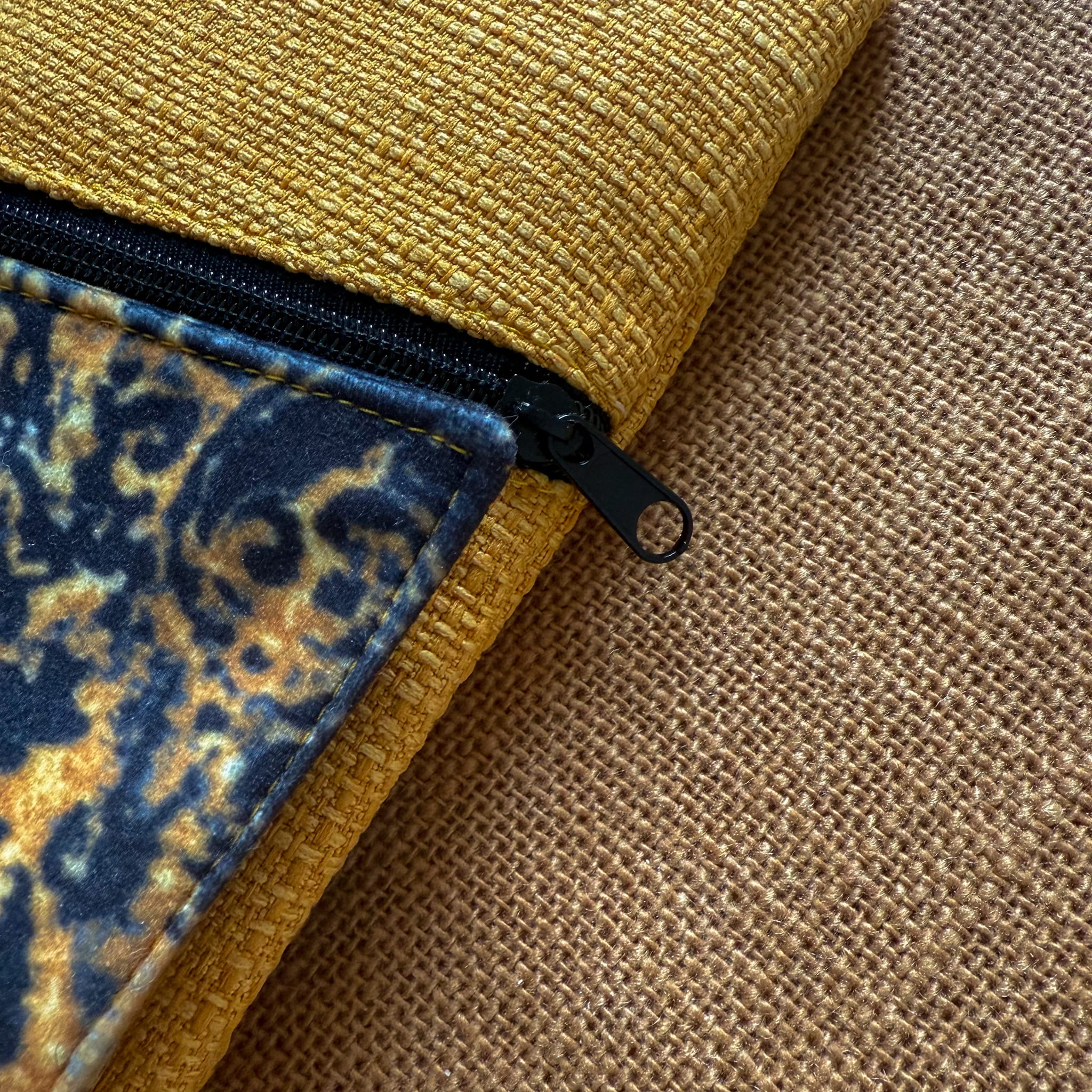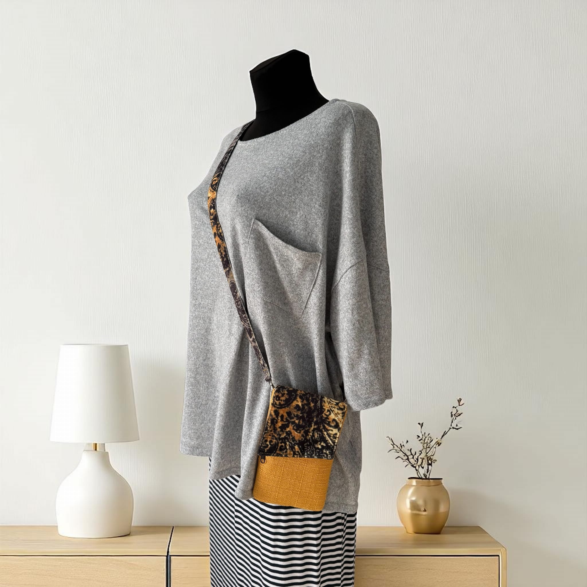 Powstała tylko jedna taka sztuka. Uszyta z końcówek tkanin tapicerskich: czarno żółtego weluru i żółtej tkaniny obiciowej o grubym splocie – to upcykling w praktyce. Dzięki temu masz pewność, że nikt inny nie będzie miał identycznej.
