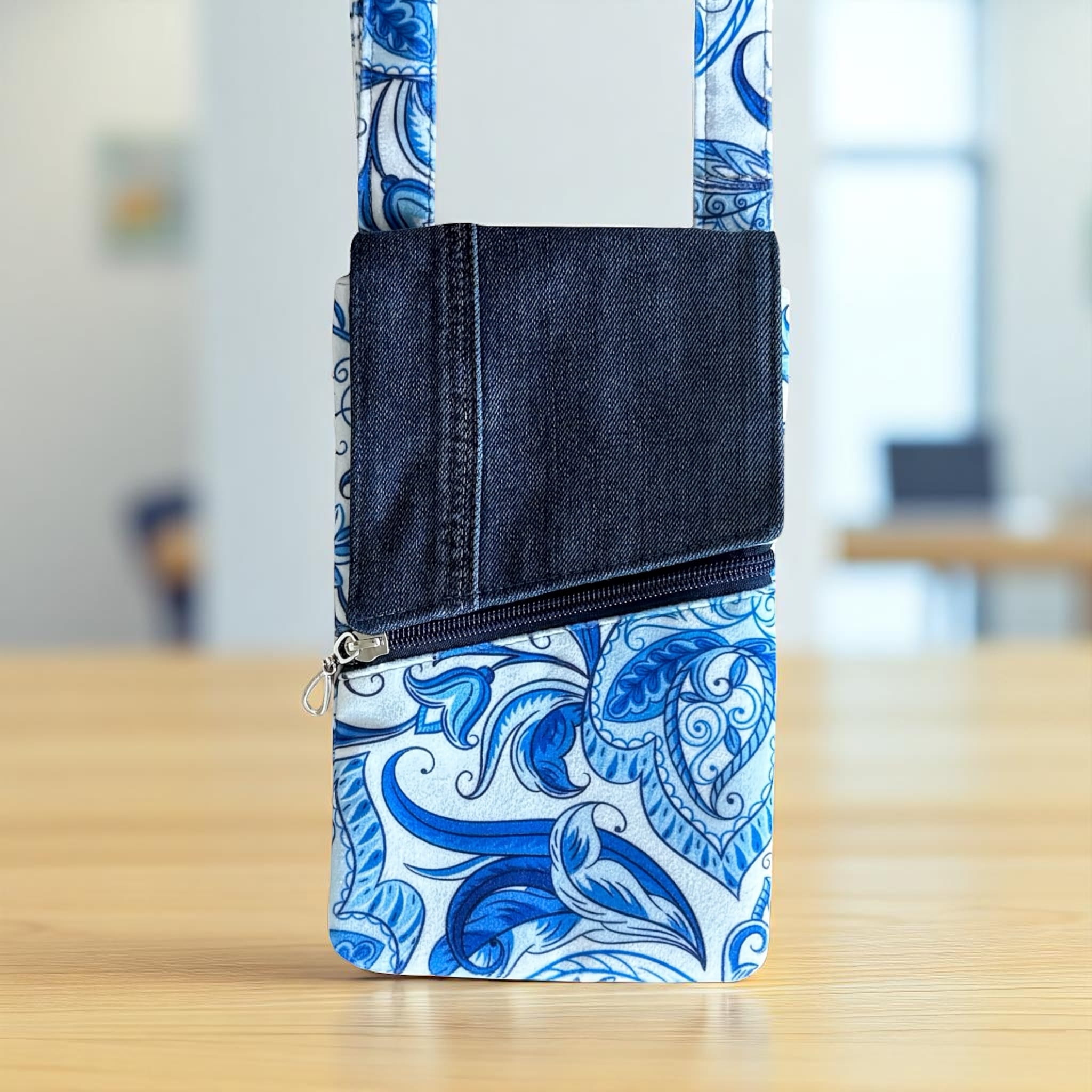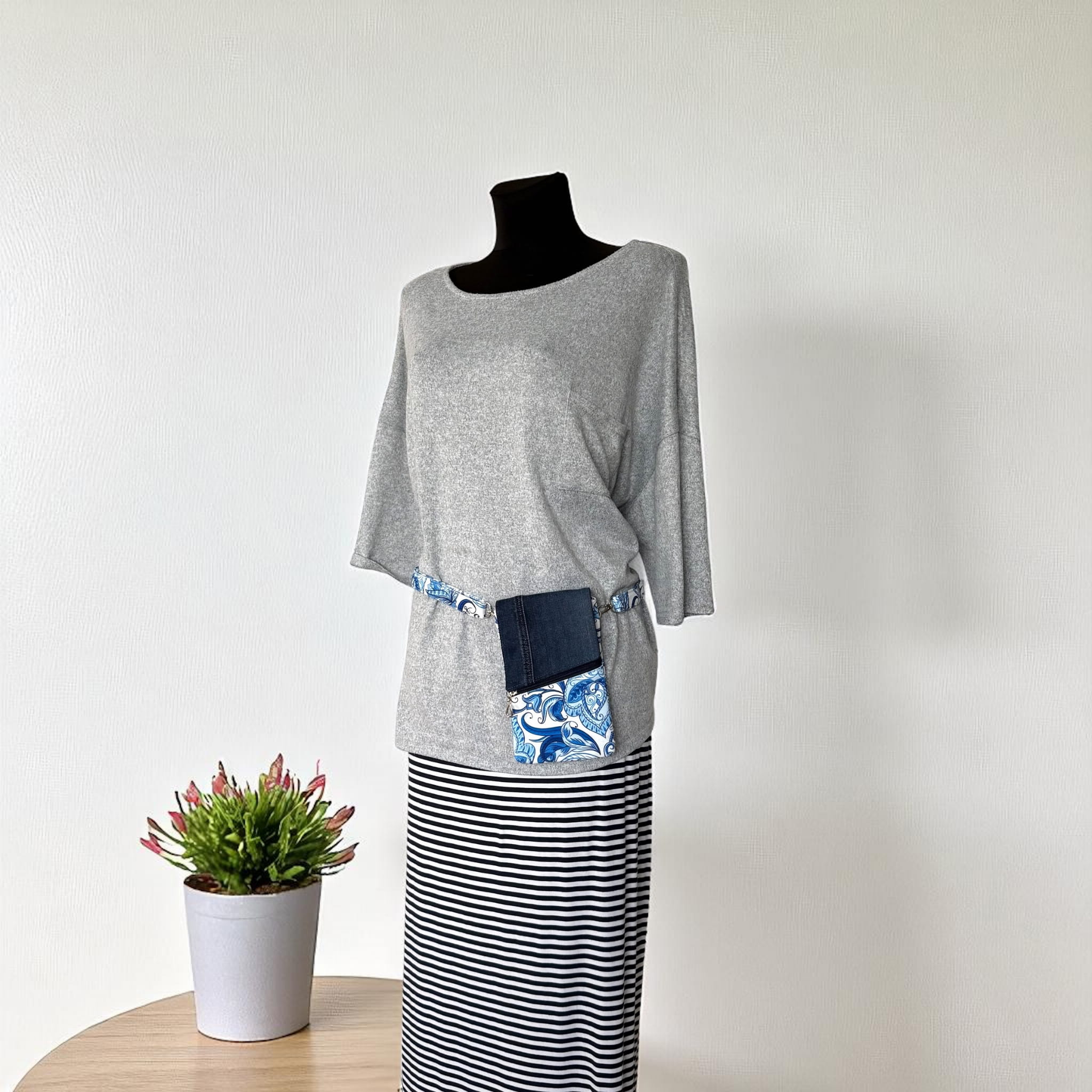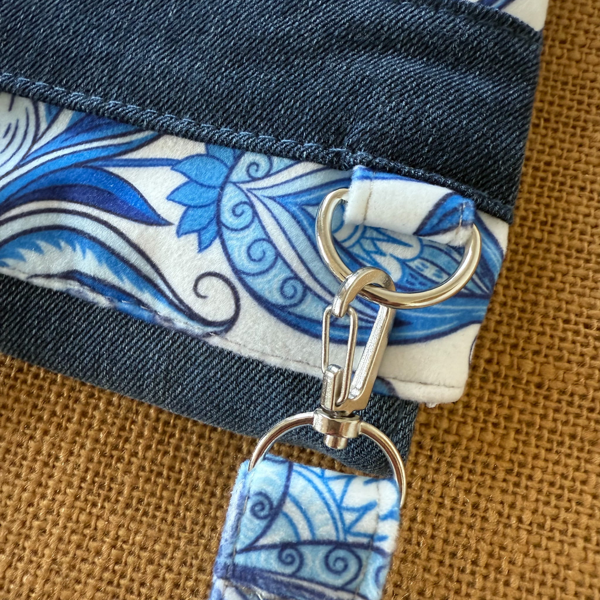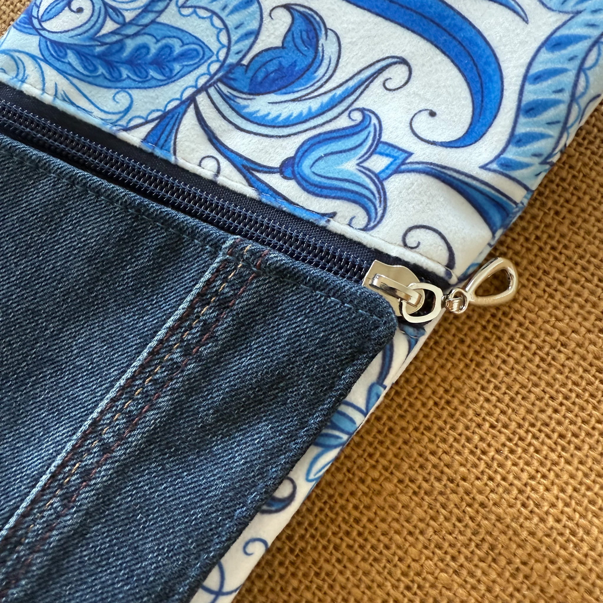 Powstała tylko jedna taka sztuka. Uszyta z końcówki aksamitnego weluru tapicerskiego i nieużywanych już jeansów – to upcykling w praktyce. Dzięki temu masz pewność, że nikt inny nie będzie miał identycznej.