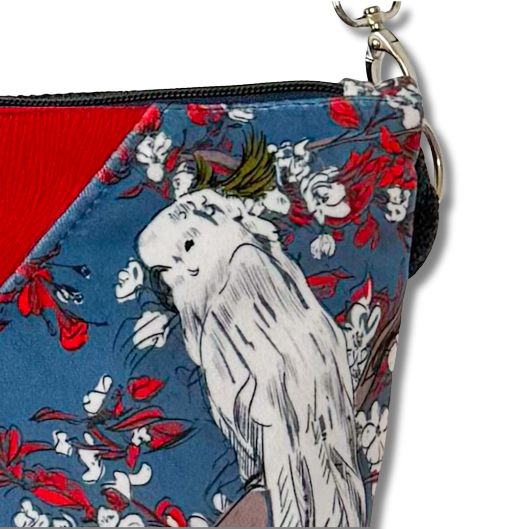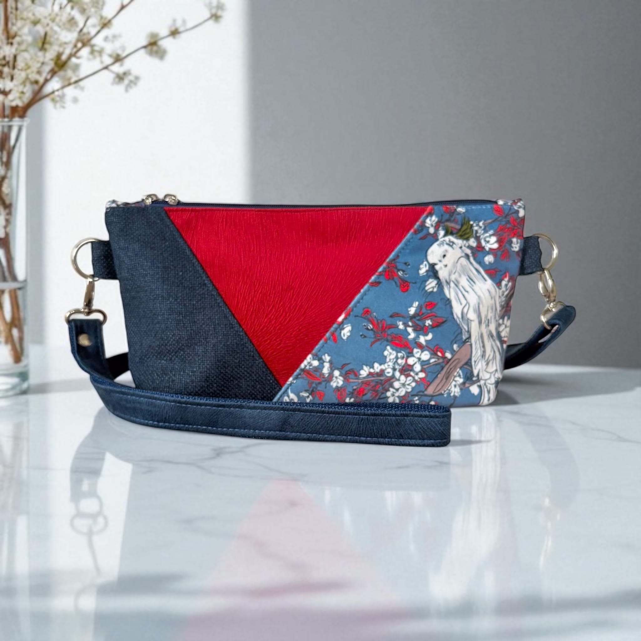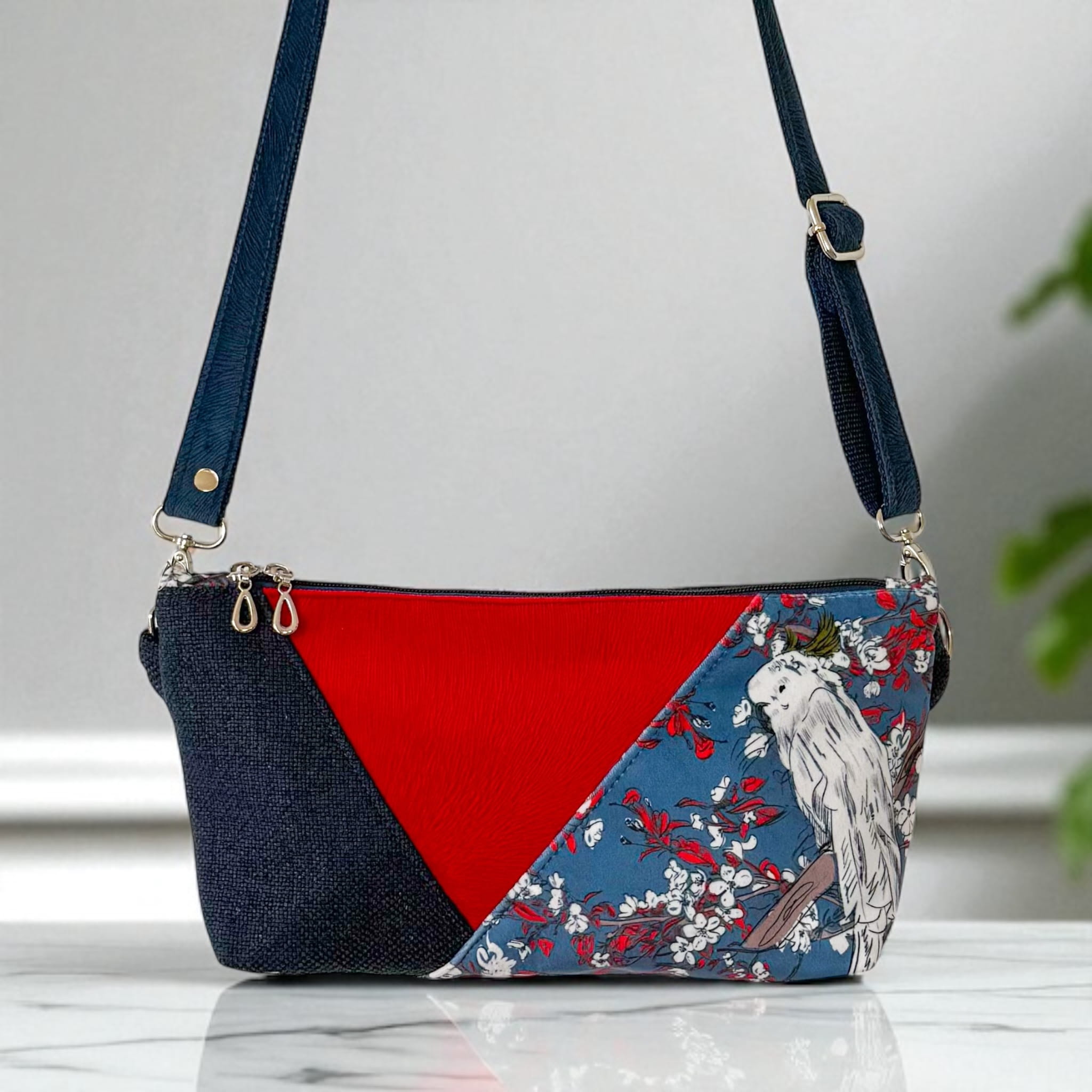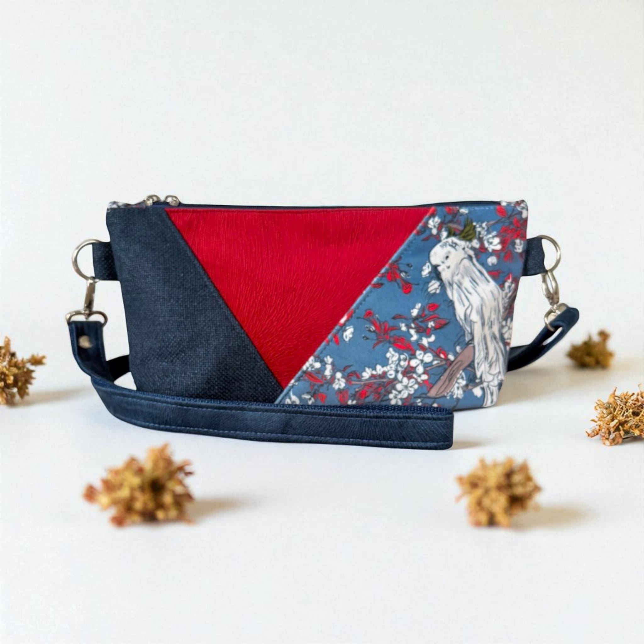 Funkcjonalna, kompaktowa torebka wykonana z końcówek tkanin tapicerskich. Z jednej strony czerwona wstawka i nadruk z papugą na tle kwitnących gałęzi, z drugiej – gładka, granatowa tkanina o wyraźnym splocie. Dzięki dwustronnej konstrukcji możesz nosić ją na dwa sposoby – wybierając styl w zależności od okazji.
