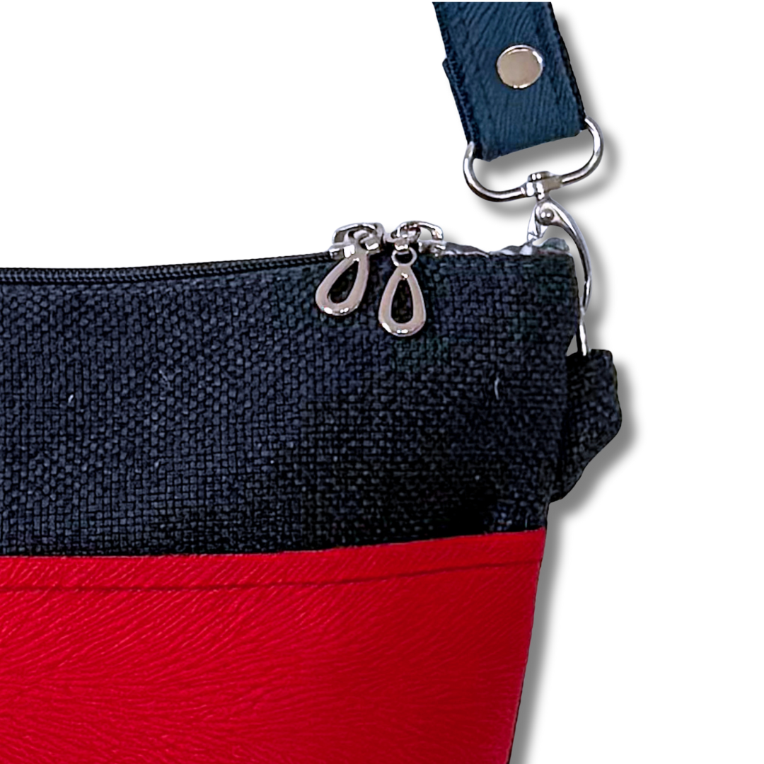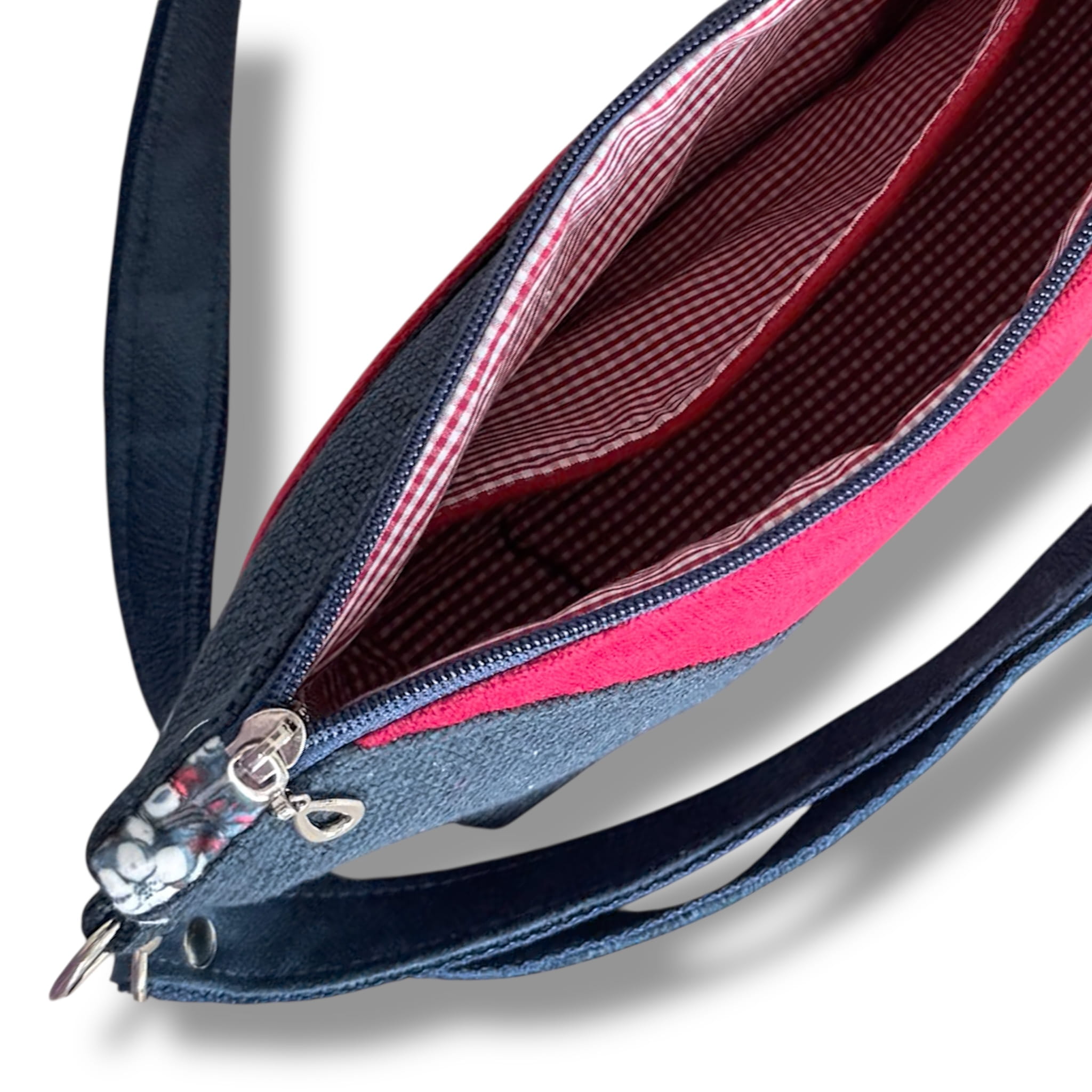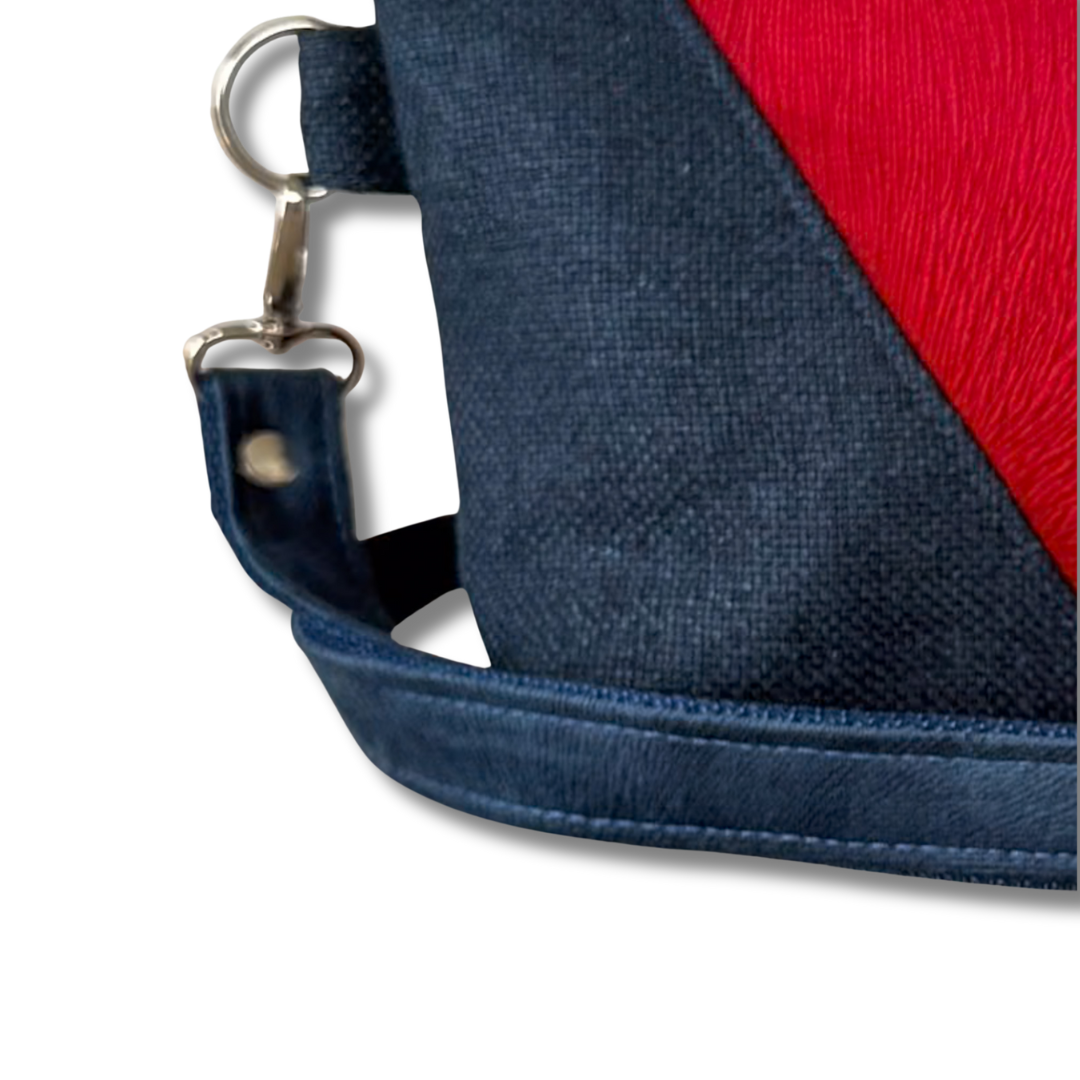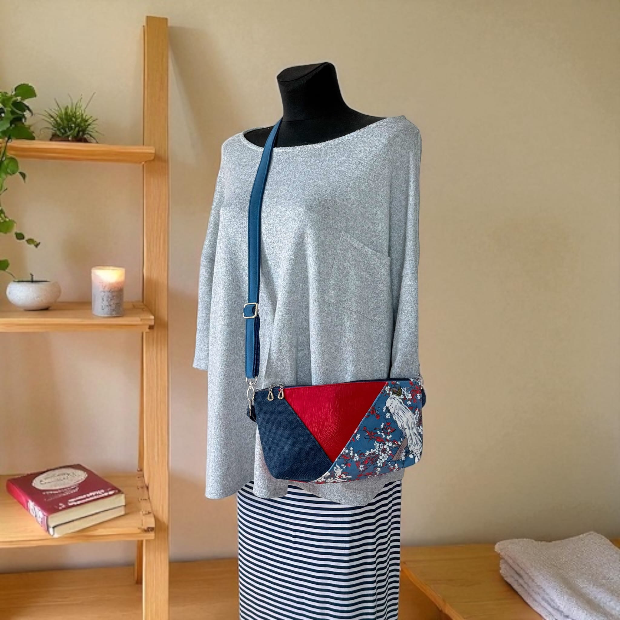 Funkcjonalna, kompaktowa torebka wykonana z końcówek tkanin tapicerskich. Z jednej strony czerwona wstawka i nadruk z papugą na tle kwitnących gałęzi, z drugiej – gładka, granatowa tkanina o wyraźnym splocie. Dzięki dwustronnej konstrukcji możesz nosić ją na dwa sposoby – wybierając styl w zależności od okazji.