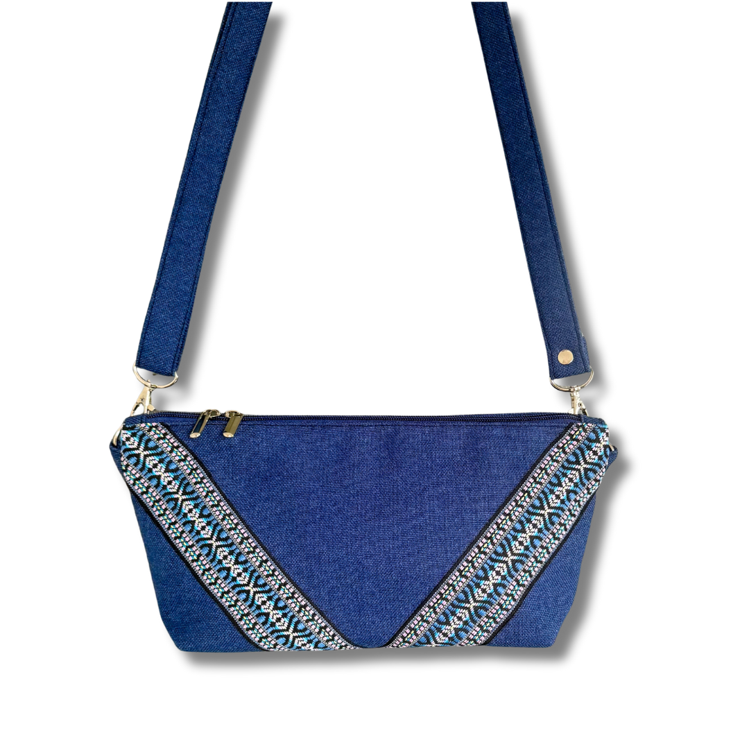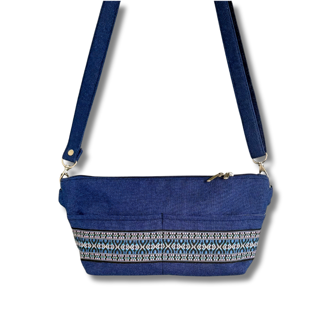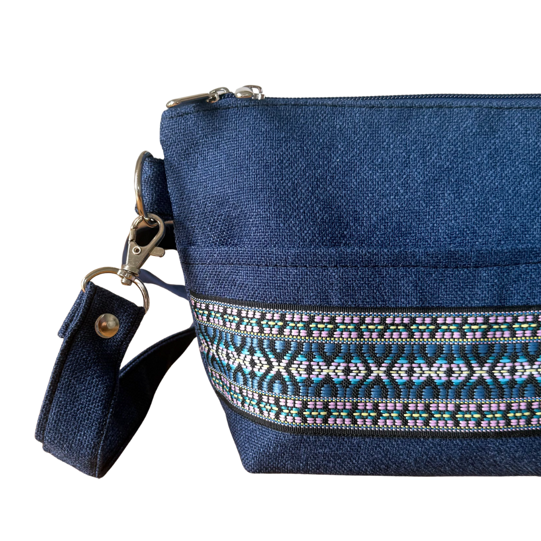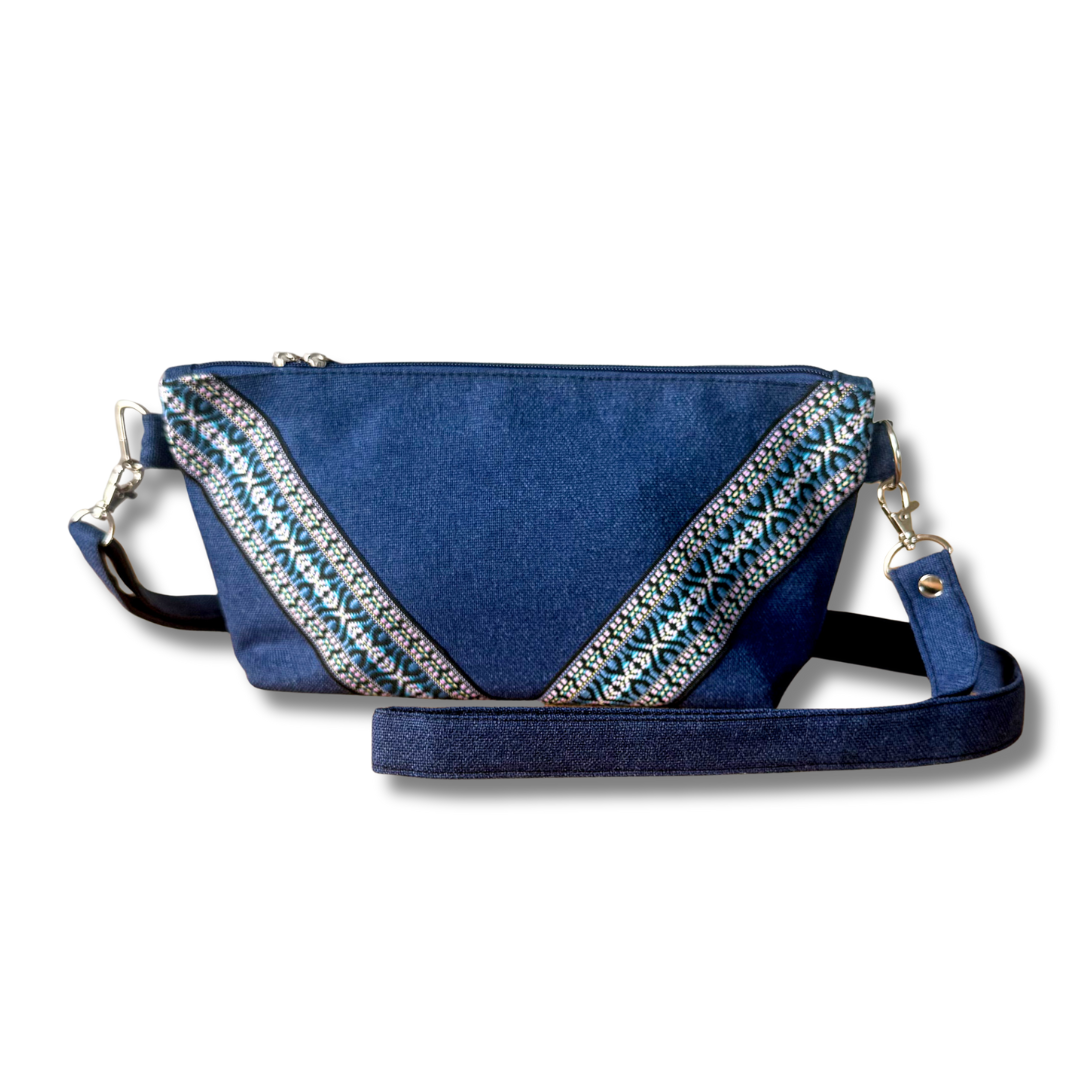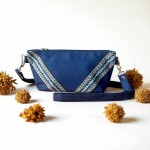 Powstała z odzyskanych materiałów: plecionej tkaniny tapicerskiej o wyrazistej fakturze oraz ozdobnej żakardowej taśmy. Dwie różne strony torebki pozwalają nosić ją na dwa sposoby – zyskujesz dwa wzory w jednym dodatku, który łatwo dopasujesz do różnych stylizacji.
