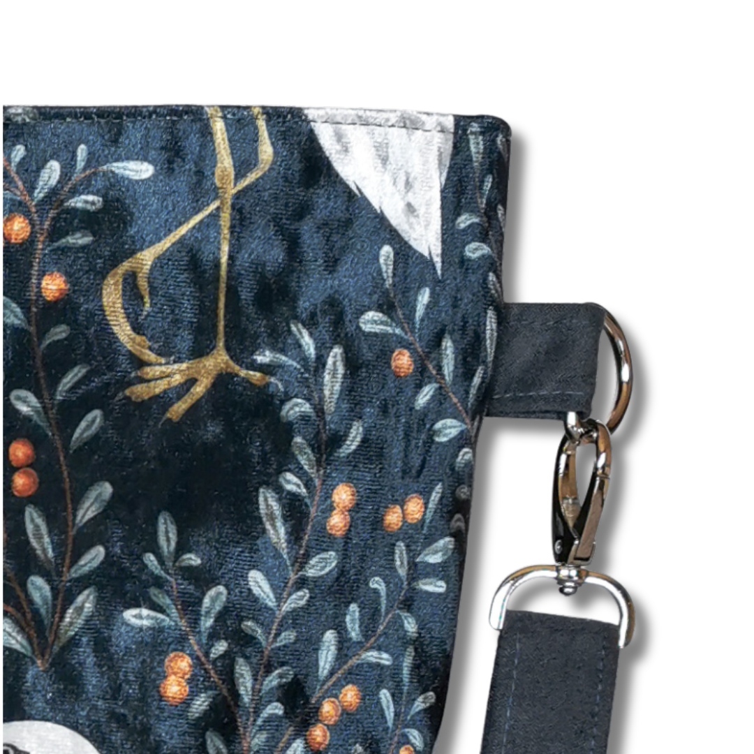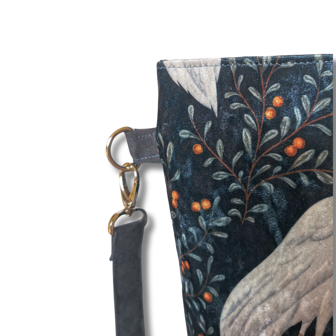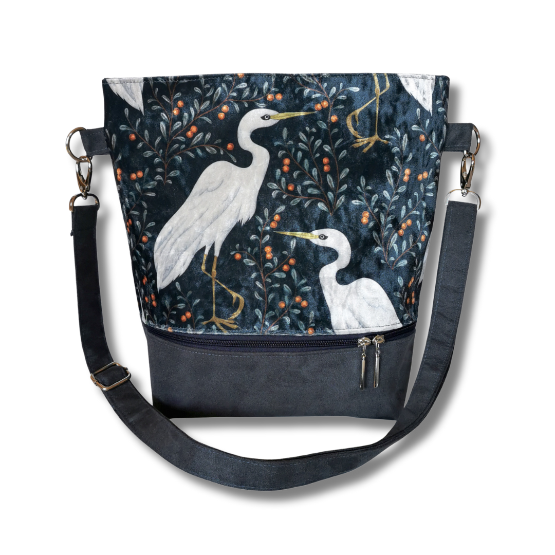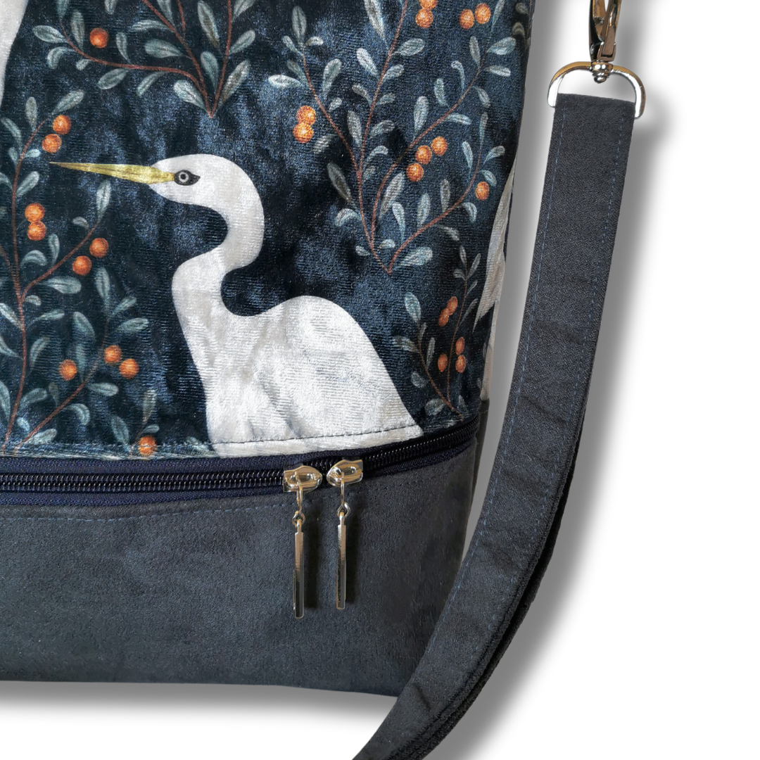 To nie jest zwykła torebka. To mała historia opowiedziana tkaniną – mocnym, przyjemnym w dotyku welurem tapicerskim, który łączy trwałość z elegancją. Wzór? Prawdziwa perełka – unikalna grafika z motywem białych ptaków na tle roślin, której nie znajdziesz nigdzie indziej.