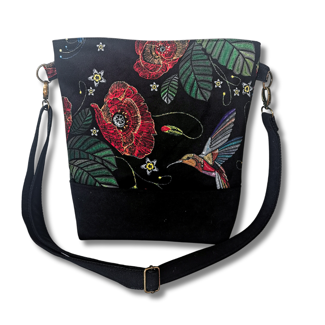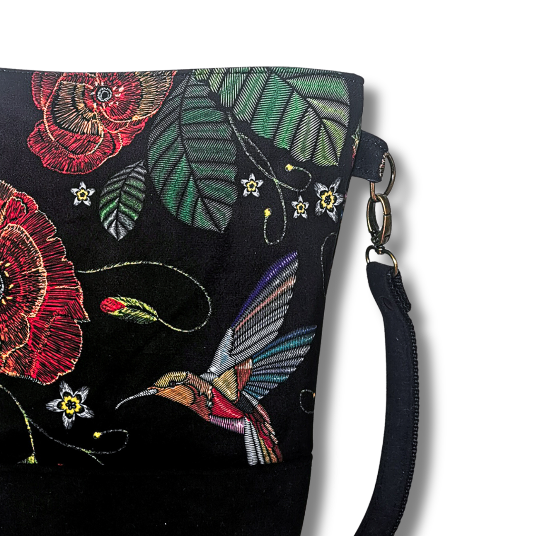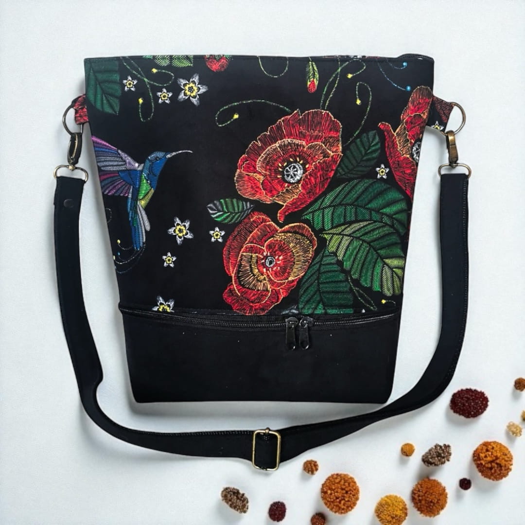 Lubisz rzeczy z charakterem? Ta torebka to coś więcej niż praktyczny dodatek – to wyraz Twojej osobowości. Uszyta z miękkiego materiału o niepowtarzalnym wzorze – czerwone maki i kolorowe kolibry na czarnym tle przyciągają spojrzenia, dodają energii i wywołują uśmiech.