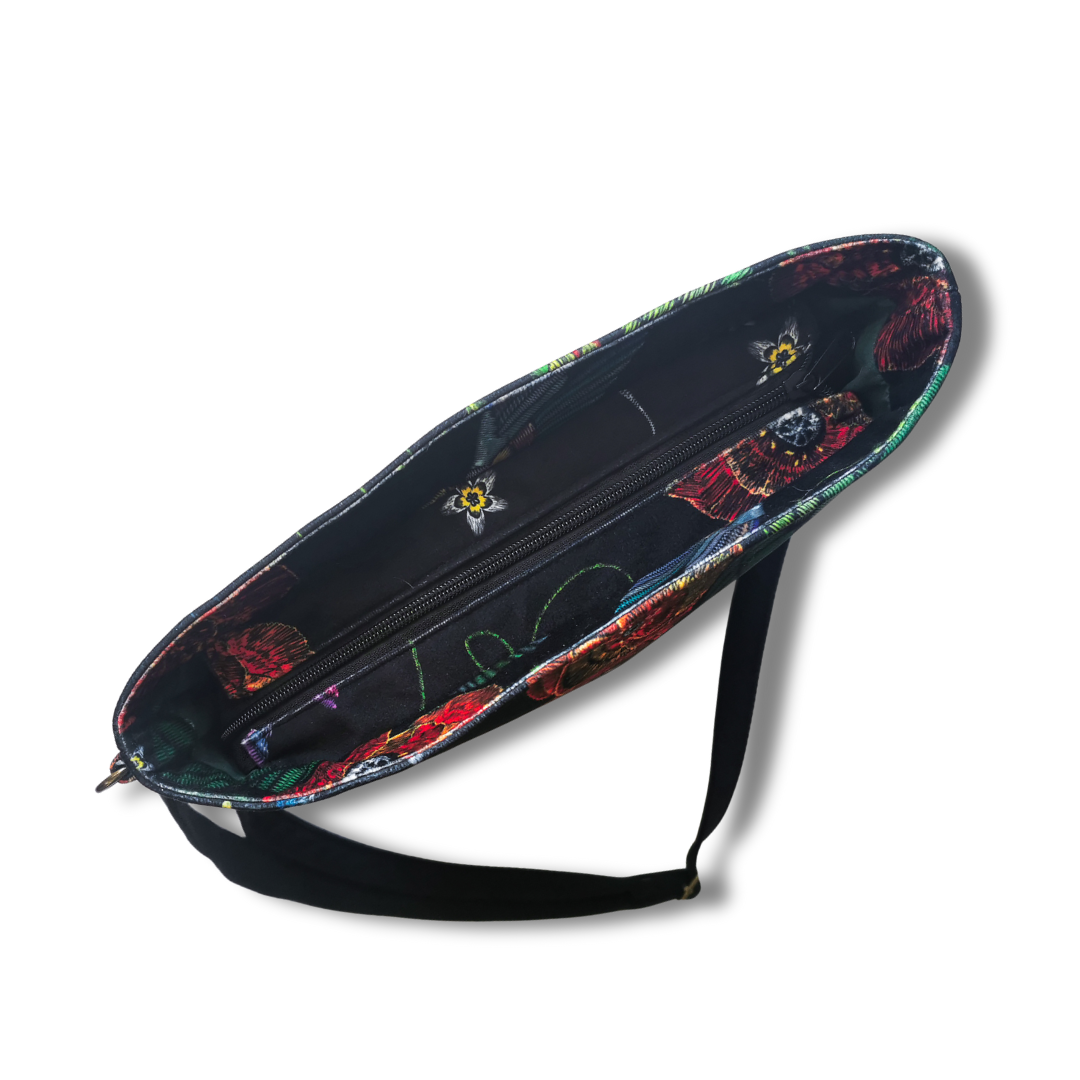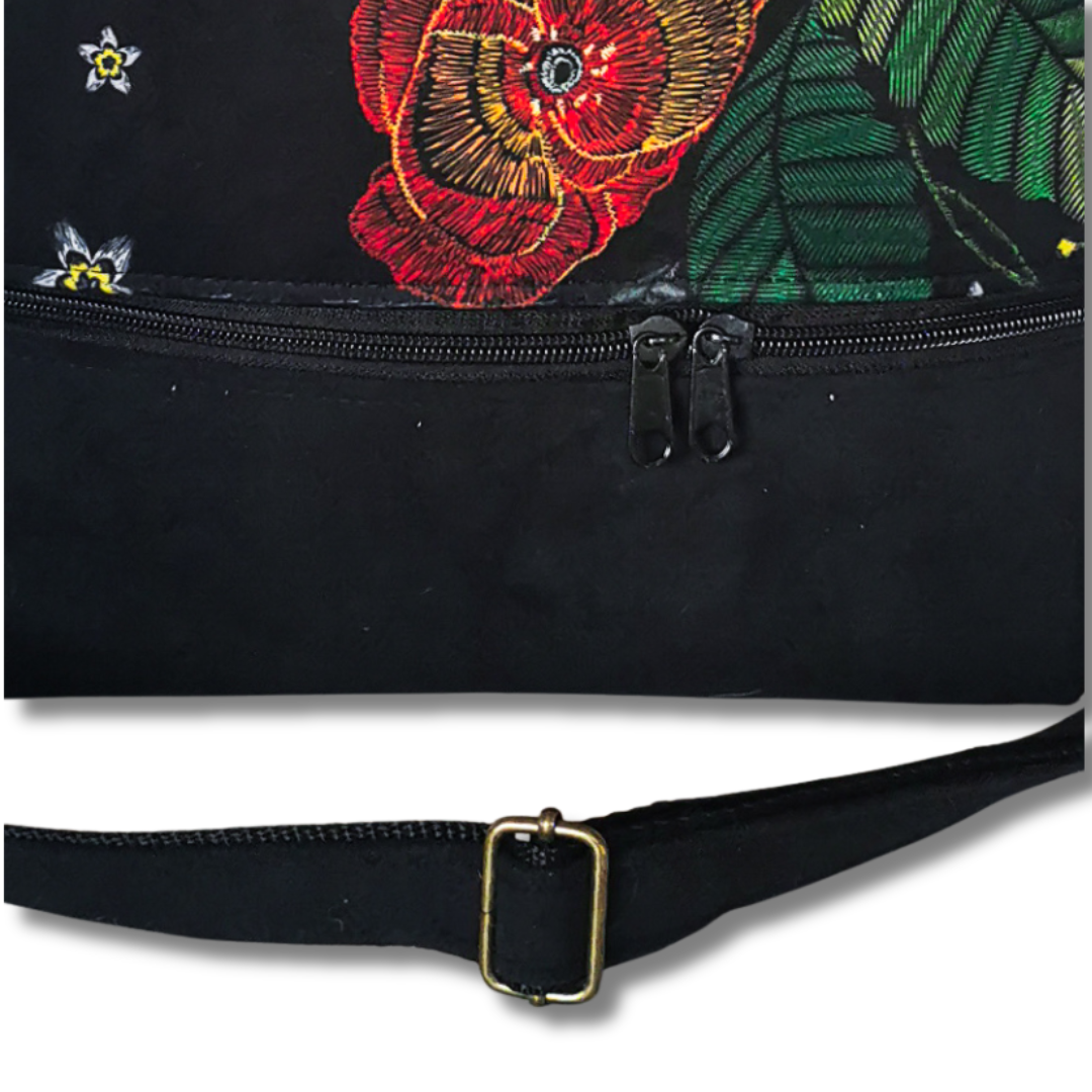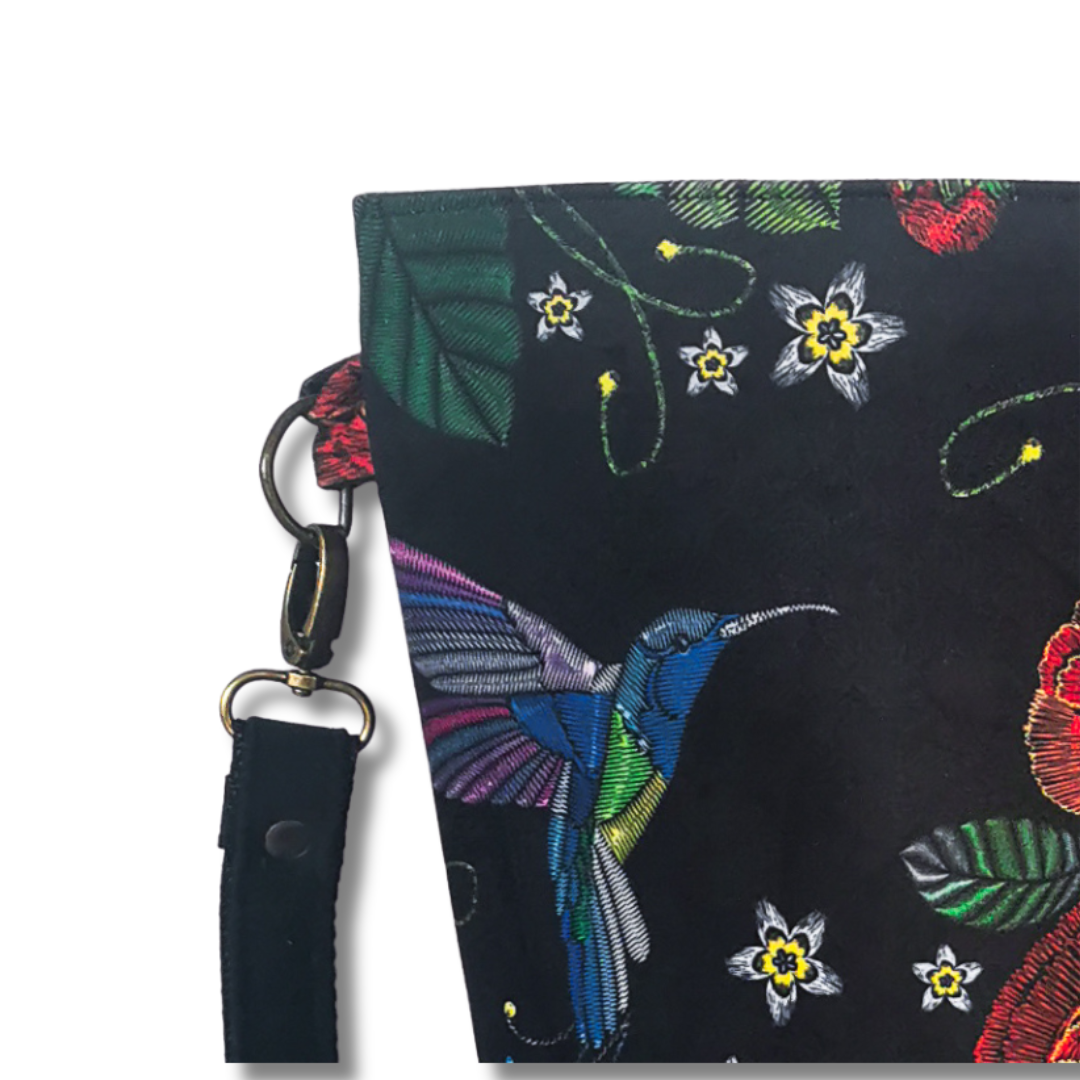 Lubisz rzeczy z charakterem? Ta torebka to coś więcej niż praktyczny dodatek – to wyraz Twojej osobowości. Uszyta z miękkiego materiału o niepowtarzalnym wzorze – czerwone maki i kolorowe kolibry na czarnym tle przyciągają spojrzenia, dodają energii i wywołują uśmiech.
