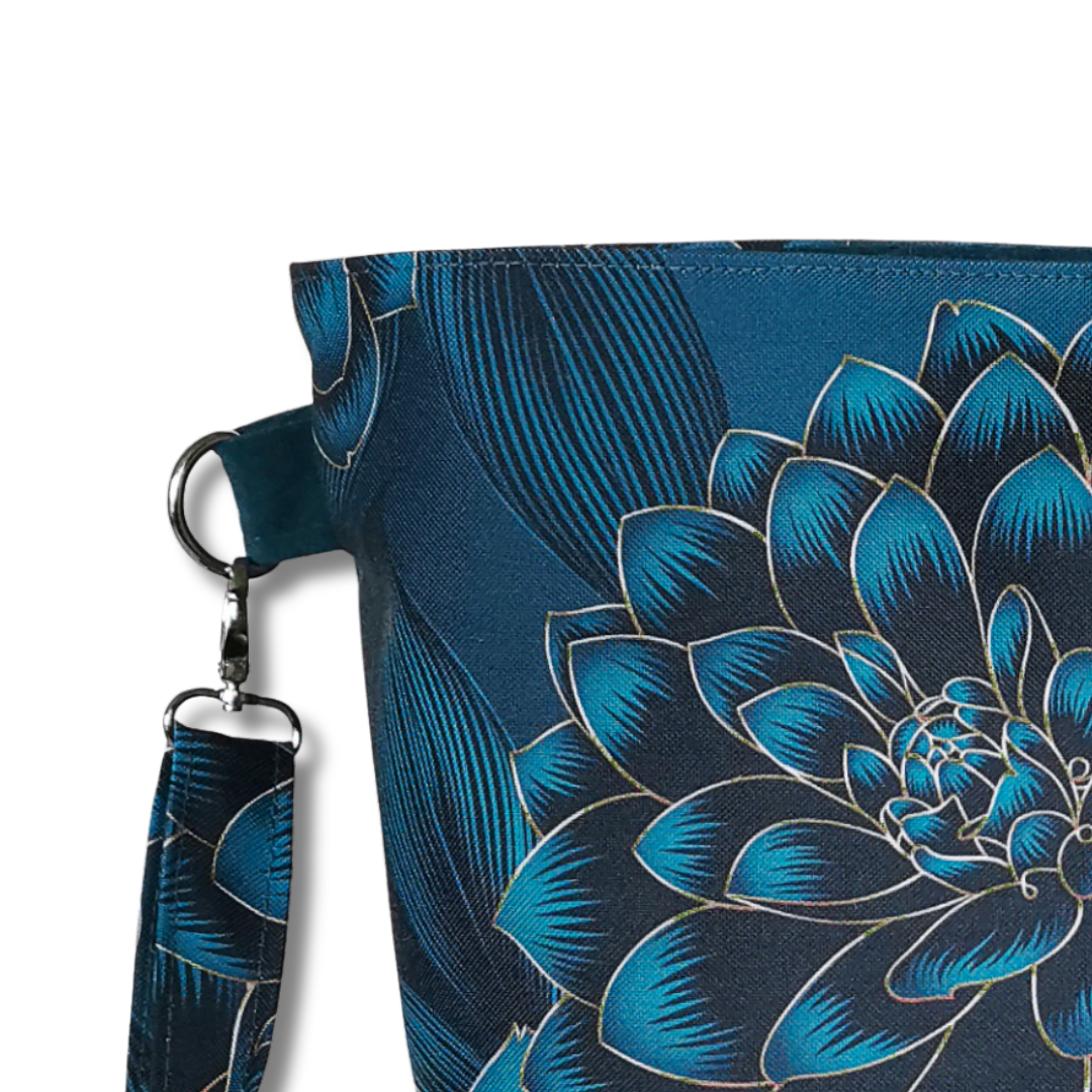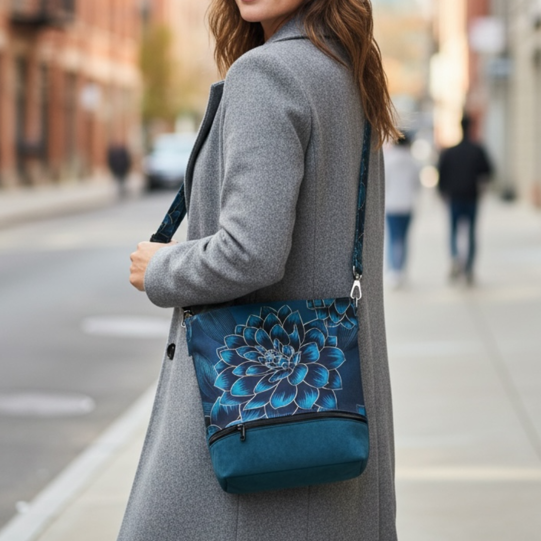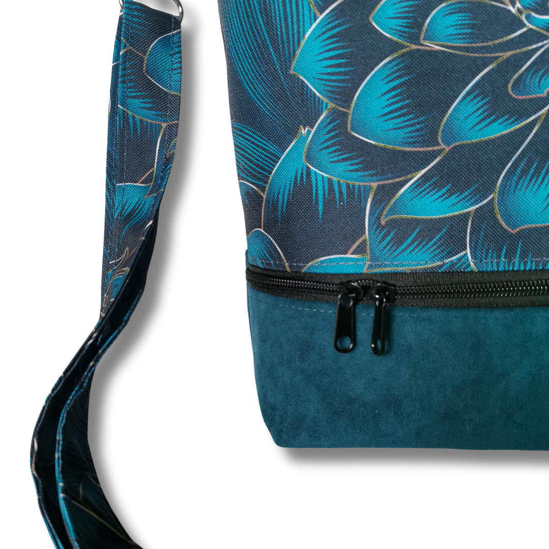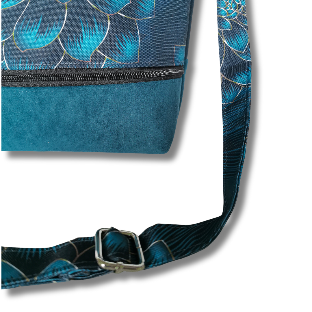 Ta torebka listonoszka NIEBIESKI KWIAT została uszyta z połączenia tkaniny wodoodpornej z welurem w kolorze morskim. Wzór i morskie odcienie kolorów od razu przyciągają uwagę i wprowadzają do stylizacji energię oraz charakter. To model z krótkiej serii, więc masz pewność, że Twój dodatek będzie wyjątkowy.
